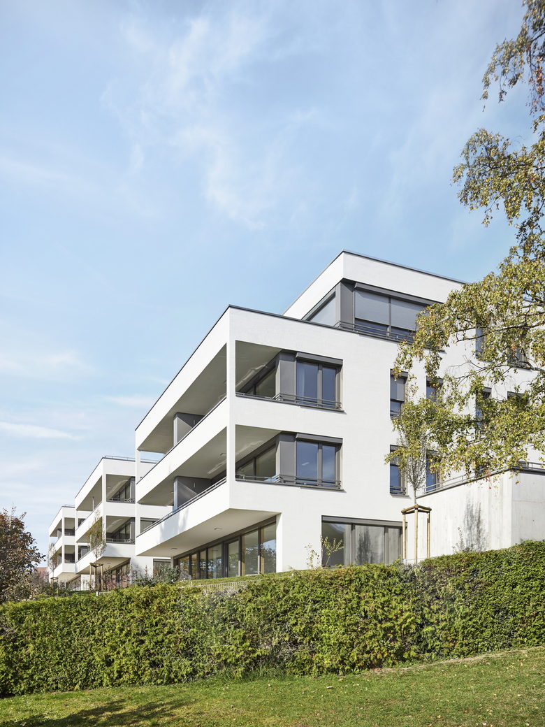 Planungsaufgabe / Standort – Das Quartier unterhalb des Pforzheimer Wartbergs ist durch die Wartbergsiedlung aus den 1920er Jahren geprägt. Im unmittelbaren Anschluss an diese denkmalgeschützte Siedlung wurden die hier seit der Nachkriegszeit befindlichen Einfach-Behelfswohnbauten rückgebaut und im Sinne einer Quartiers-Nachverdichtung drei neue Punkthäuser mit barrierefreien Wohnungen errichtet. Das Motiv der gereihten Einzelhausbebauung der Wartbergsiedlung wird mit den drei neuen Einzelbaukörpern fortgesetzt. Die Maßstäblichkeit des Bestands findet ihre Fortsetzung außerdem in der Terrassierung und topographischen Integration der neuen Baukörper. Die erforderliche Tiefgarage ist so in die Hangkante integriert dass auch in der untersten Ebene noch Wohnraum mit Blick in Richtung Tal angeboten werden konnte.