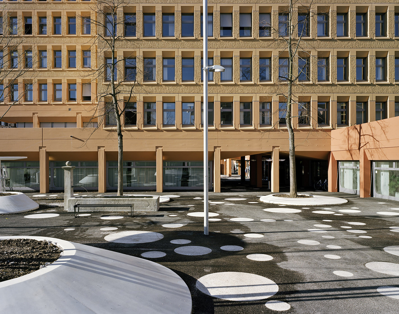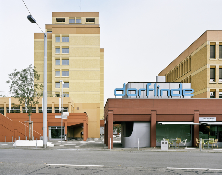 Die drei Publikumsebenen der Anlage sind in ihrer Wirkung gestärkt und über neue grosszügig angelegte Treppenanlagen besser miteinander verbunden worden: Der Garten wird verdichtet, der Platz auf Strassenniveau dagegen räumlich geöffnet und das unterirdische Parkhaus besser in den öffentlichen Raum miteinbezogen. Die einheitliche neue Farbgebung beruht auf dem ursprünglichen Farbkonzept und lässt mit dem neuen Goldschimmer auf den groben Putzflächen und im Zusammenwirken mit weiteren gestalterischen Massnahmen die massigen Dorflindebauten wesentlich leichter und zeitgemässer erscheinen.