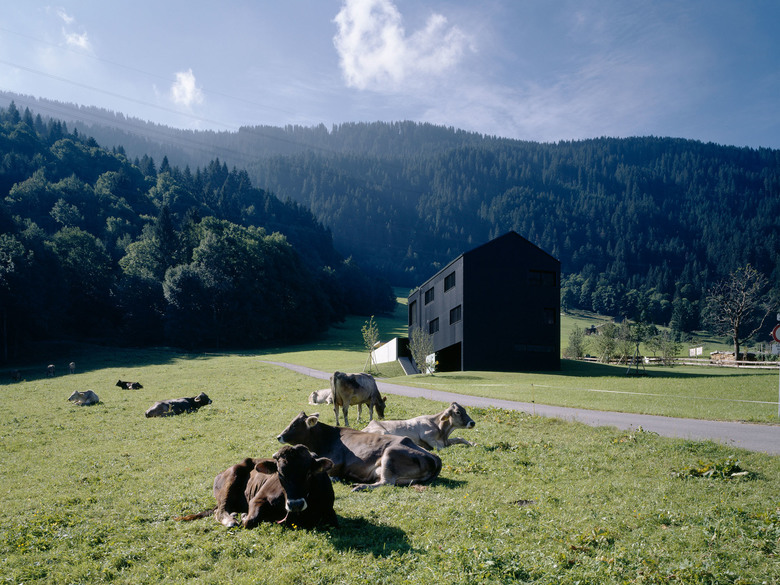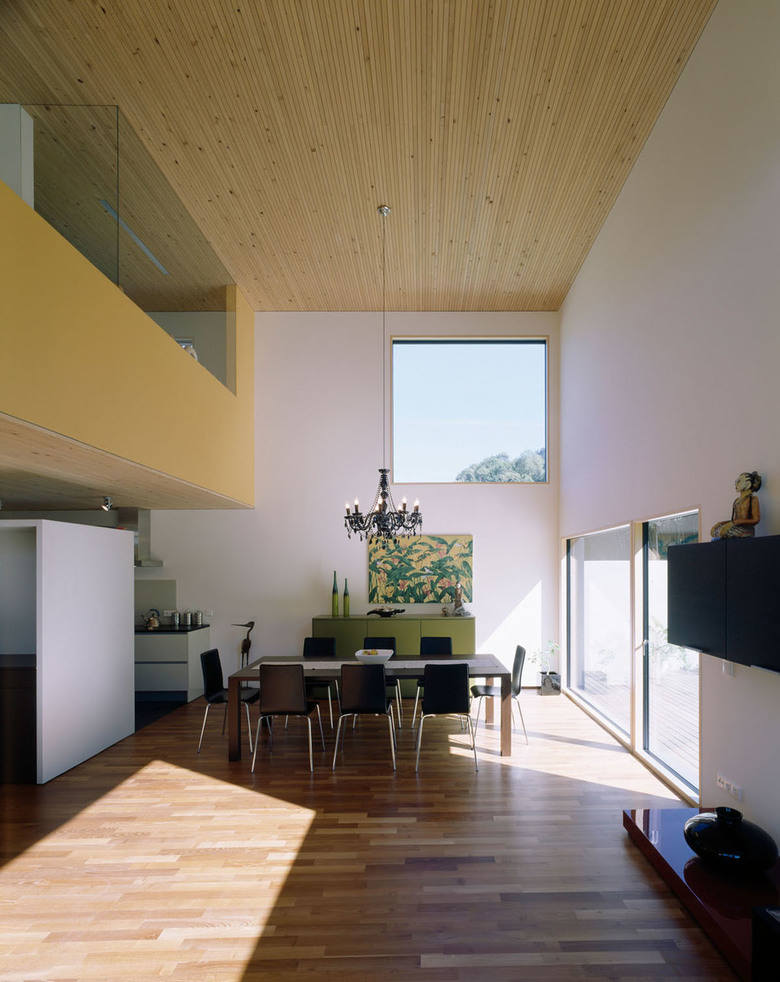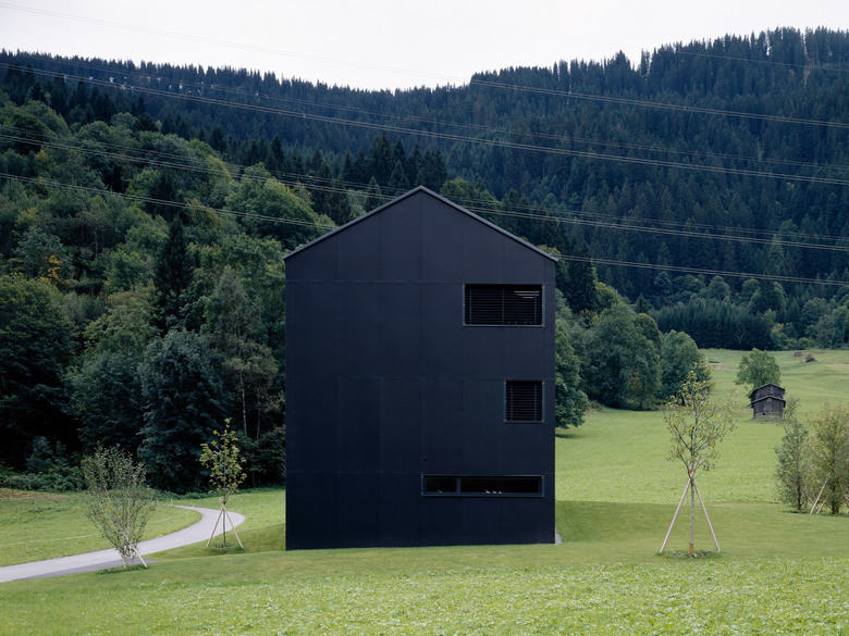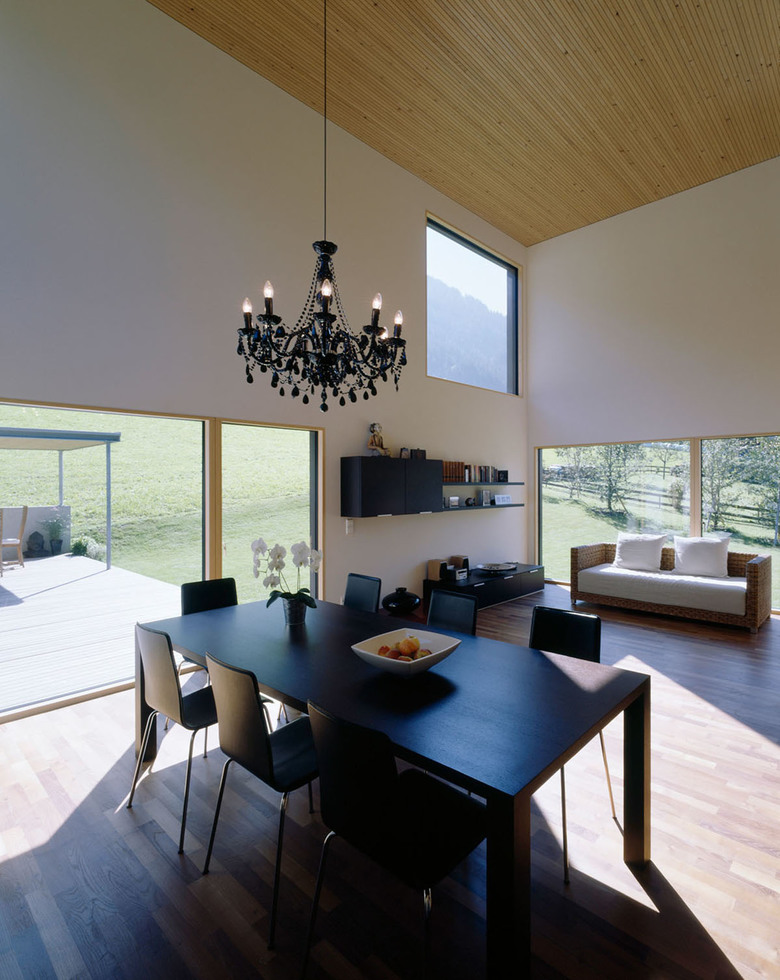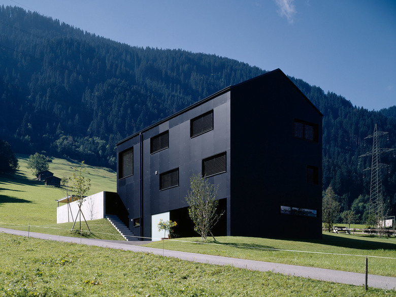 Das Wohnhaus der Familie Stürz befindet sich in relativ steiler Hanglage auf ca. 1.000 m Meereshöhe in Dalaas / Vorarlberg. In die ländliche Umgebung mit traditionell errichteten Nachbargebäuden gliedert sich der Neubau mit moderner Formensprache ein, ohne sich anzubiedern. Die Erschließung erfolgt von unten, dem massiven Sockel, der Wohnbereich erstreckt sich über die beiden oberen Geschosse, die über einen Luftraum im Süden zusammengebunden werden. Durch gezielt gesetzte Öffnungen nach draußen und interne Verbindungen entstehen lichtdurchflutete Räume, die immer unterschiedliche Beziehungen zum Naturraum aufbauen. Das Gebäude ist im Holzbausystem „oa.sys“ = offenes architektur system (Berlinger Holzbau) errichtet, das ein flexibles und wirtschaftliches Modulsystem in Holzbauweise bezeichnet. Wand- und Deckenbauteile sind in Abmessung und Aufbau klar definiert und systematisiert, die Elemente werden industriell hergestellt. In der Systembauweise liegt der wesentliche Vorteil gegenüber dem herkömmlichen Holzbau. Zusätzlich bietet oa.sys im Gegensatz zur bekannten Fertigbauweise die Möglichkeit, jedes Projekt nach den individuellen Bedürfnissen des einzelnen Kunden zu realisieren