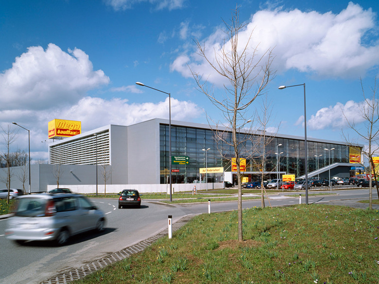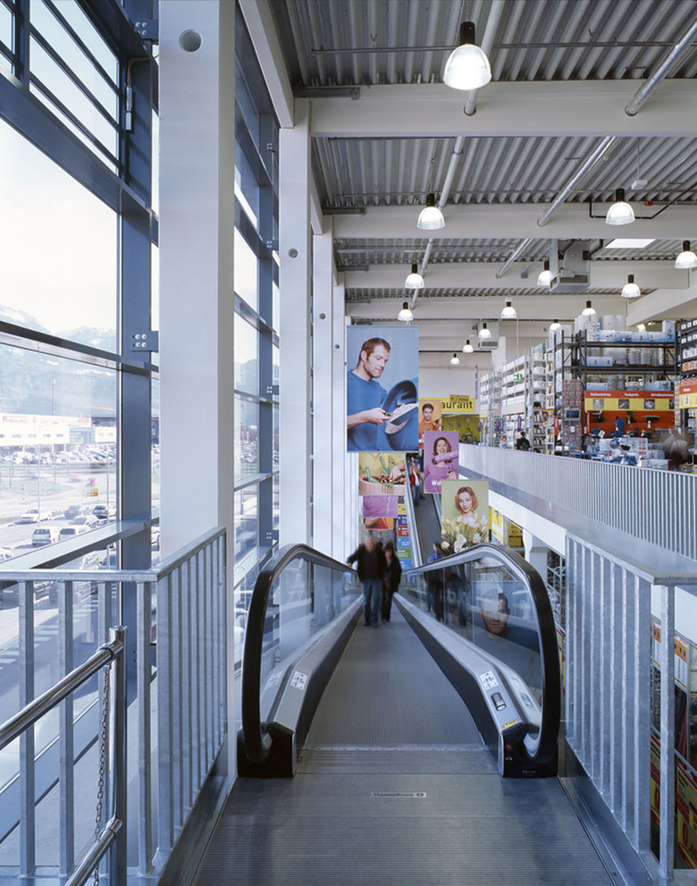 Eine große Handelskette wie Baumax betreibt professionelle Kundenerforschung und plant in eigenen Abteilungen Abläufe und Warenpräsentation bis ins kleinste Detail, wie Lagerregalmillimeter und Schriftart der Preisschilder. Der Handlungsspielraum der Architekten ist im Innenleben eingeschränkt. Auf die große Form, Struktur, Erschließung und Ausrichtung des Gebäudes bleibt die Konzentration gerichtet, über die Gestaltung eines Restaurantbereiches zum Beispiel, muss man sich keine Gedanken machen, das ist anderen überlassen. Die verglasten, offenen, freundlichen Seiten im Süden und Osten schauen zur Stadt. Geschlossen, aufgeräumt, mit Fassaden aus Blech stehen die übrigen Fronten zur Autobahn. Im Baumarkt, der jeden Zentimeter nutzt um den Patchworkteppich des Produkte-Sammelsuriums auszubreiten, ist Orientierung und Raumempfinden wesentlich. Über den doppelläufigen Rollsteig entlang der Glasfassade ist die imposante Größe des Bauwerkes zu erfassen und erleben. Großzügig wirkt auch der zweigeschossige Teil des Gartencenters im Süden. Die übrigen Abteilungen -Schwerlastabteilung im EG, Werkzeuge und Raumausstattung im OG - sind einstöckig. Wer in den Regalschluchten verloren zu gehen droht, orientiert sich nach dem Lichteinfall. Bei der Betonfertigteilkonstruktion der Halle wurde jede Stütze statisch optimiert. Stützen und Träger variieren in der Dimension nach abgetragenen Lasten. Um den Außenbereich der Gartenabteilung geordnet zu halten, wird die Fassade als uneinsichtige Innenhofwand weiter gezogen. Die drei beabsichtigten Werbewürfel am Dach des Gebäudes konnten auf einen – kleineren – reduziert werden.