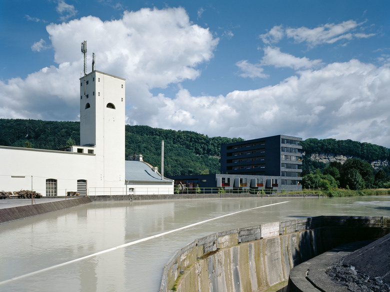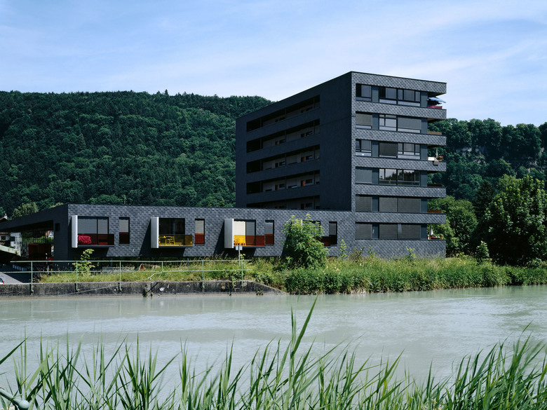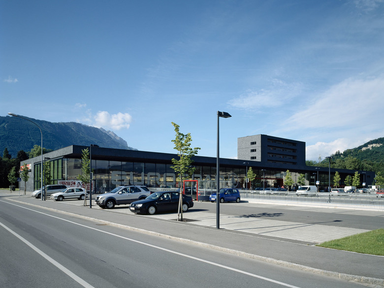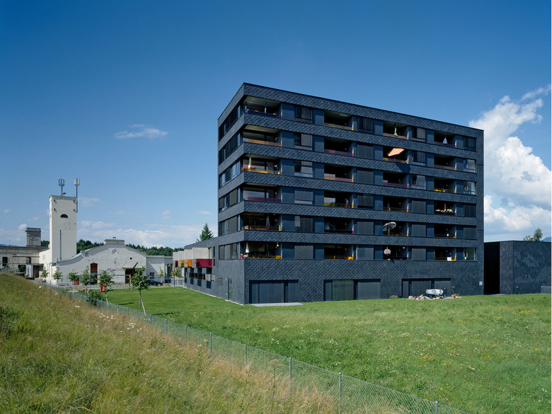 Ein neues Nahversorgungszentrum mit Supermarkt und Wohnbebauung sollte errichtet, die städtebauliche Neugestaltung des etwas 50.000 m² großen Hämmerle Areals gedacht werden. Der stimmungsvolle eingeschossige Textil-Industriebau (Spinnerei Hämmerle) aus vergangenen Zeiten im Norden, zwei unter Denkmalschutz stehende Villen mit drei Werkmeisterhäusern im Süden und im Westen der Fluss Ill stellt die einzubeziehende Situation dar. Der Neubau spannt den Zwischenraum zum Textilwerk als Platz auf und bezieht die spätere Umnutzung ein. Ein weit auslaufender Sockel beinhaltet Supermarkt und ein weiteres Diskontgeschäft. Direkt anschließend orientiert sich das siebenstöckige Wohnhaus zum Fluss. Ein Durchstich öffnet die Wegbeziehung zum projektierten Wohnbaugelände. Schwarzgraue Schiefer-Schindeln sind durchgehendes Fassadenmaterial. Um die Höhe des Supermarktes als Baukörper durchzuhalten erschließen sich vier Wohnungen ums Eck, über einen reizvollen Innenhof. Die weiteren fünf Stockwerke werden zu diesem Hof über offene Laubengänge erschlossen. Balkone oder Loggien geben den Kleinwohnungen Lebensqualität. Von den Architekten wird für die künftige Wohnbebauung ein Richtplan mit fünf unterschiedlichen Bautypen für insgesamt 300 Wohnungen vorgelegt