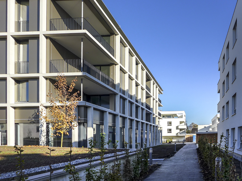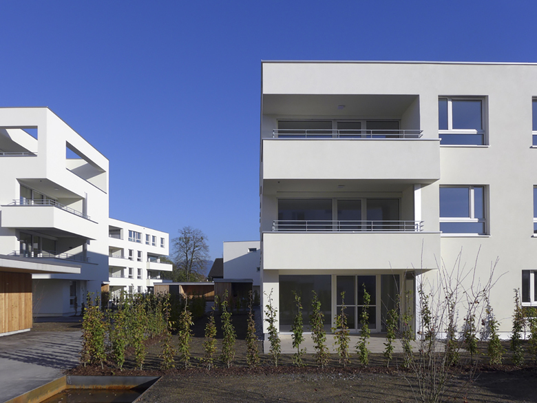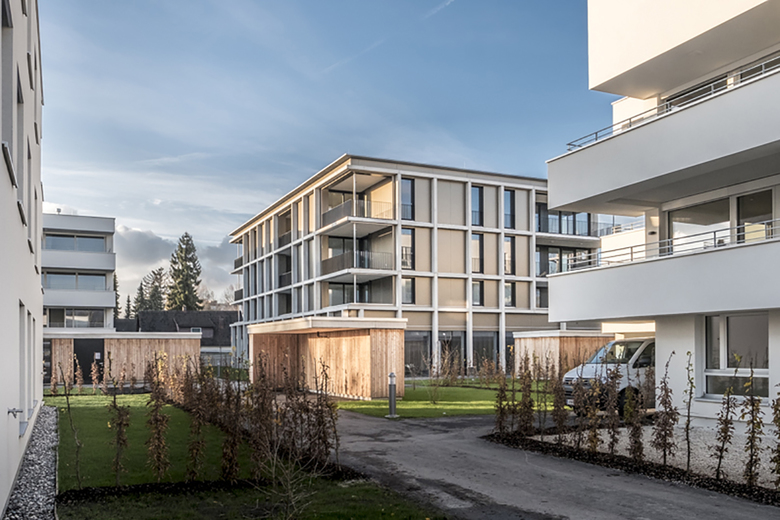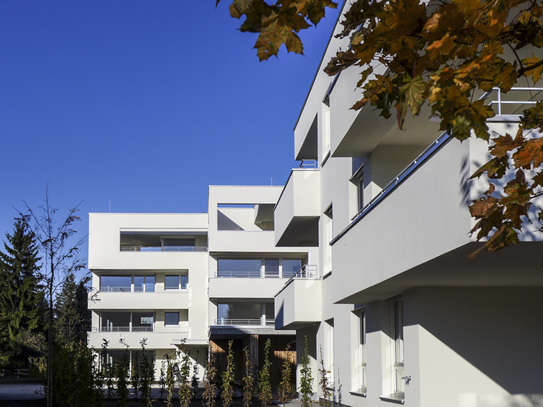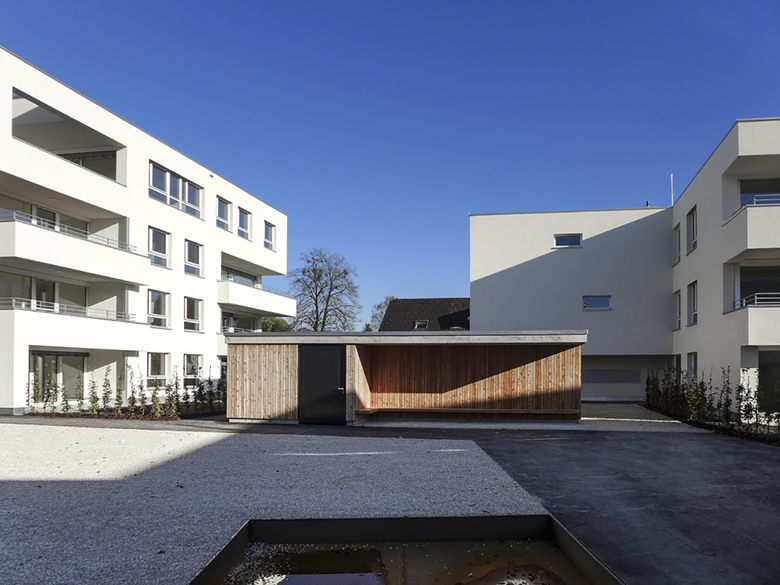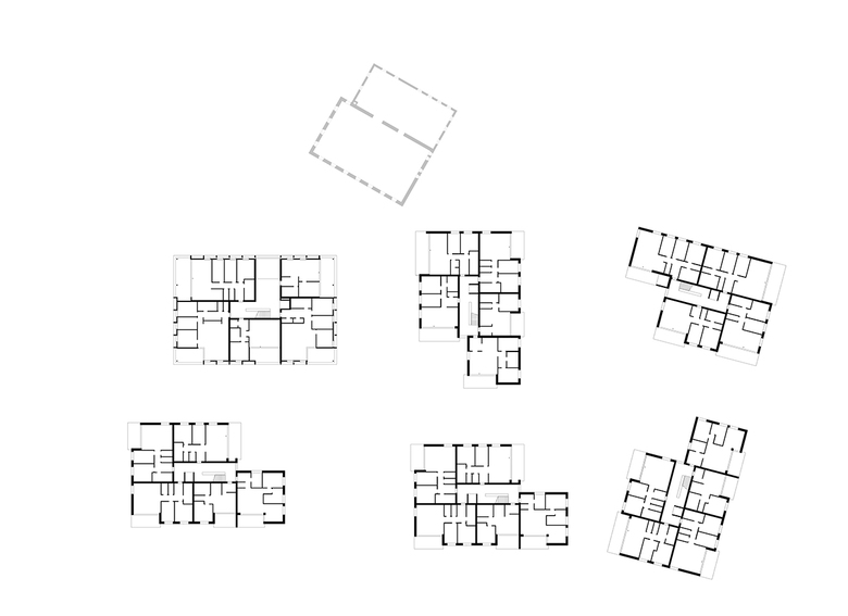 Fünf Wohnhäuser mit jeweils einer „fehlenden Ecke“ im rechteckigen Grundriss stehen verdreht zueinander am Grundstück, was nicht nur mit einer daraus resultierenden räumlichen Vielfalt, sondern auch mit dem Bezug zur dicht bebauten Umgebung des Harder Zentrums zu tun hat. Die Wohnungsgrundrisse sind entsprechend unterschiedlich und komplex, denn für jede Wohnung gelten andere Voraussetzungen. In einem sechsten Haus über dem vollständigen Rechteck sind gewerbliche Firmen und Dienstleister untergebracht, es dient als Vermittler zwischen „drinnen“ und „draußen“ und hält diese Grenze beweglich. Zugleich beginnt hier eine Abfolge von öffentlichen, halböffentlichen und privaten Räumen, Wegen, Höfen und Nischen – ein Dorf am Bach.