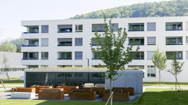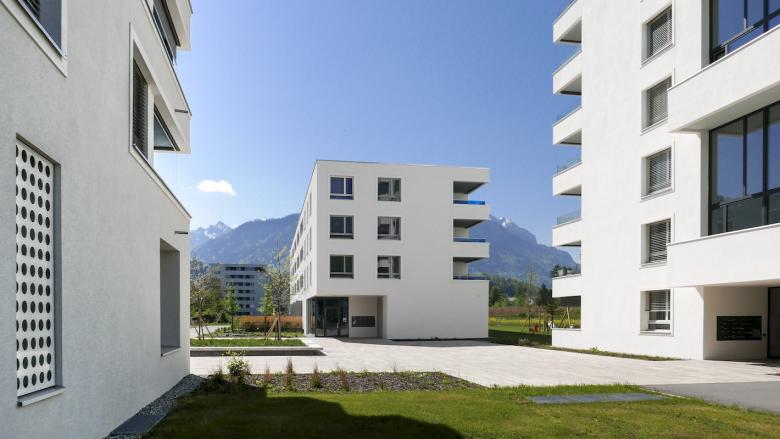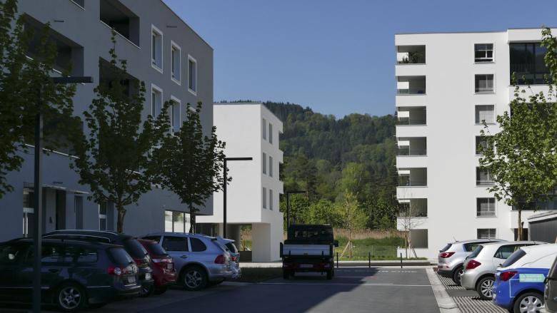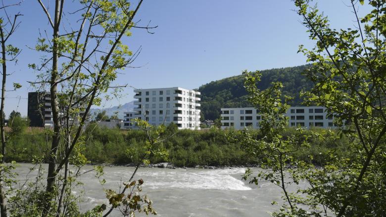 Für das Gelände einer ehemaligen Spinnerei an der Ill und ausgehend von einem Nahversorgungszentrum wurde ein städtebaulicher Masterplan entwickelt: Längs- und Punktbauten wechseln einander ab, die Finger der Längsbauten zeigen auf einen zentralen Platz, es entsteht eine Verflechtung von Grünräumen, befestigten Bereichen und Wegen, die das Areal über seine ganze Länge erschließen. Die Sockelgeschosse haben größere Raumhöhen als die Wohnungen darüber, um Flexibilität zu gewährleisten. Hier können auch Geschäfte oder Cafés sein – mit jeweils einem direkten Zugang vom leicht erhöhten Vorgarten auf den Platz. Die Wohnanlage ist auf langfristige und veränderbare Nutzung ausgelegt, die städtebauliche Konfiguration zielt ebenso darauf ab wie die dauerhafte Bauweise aus monolithischen Ziegeln.