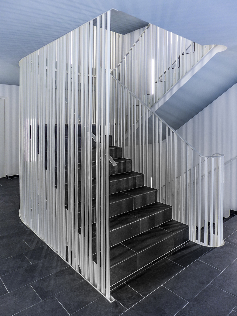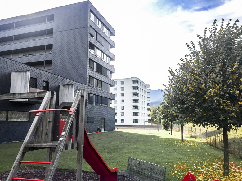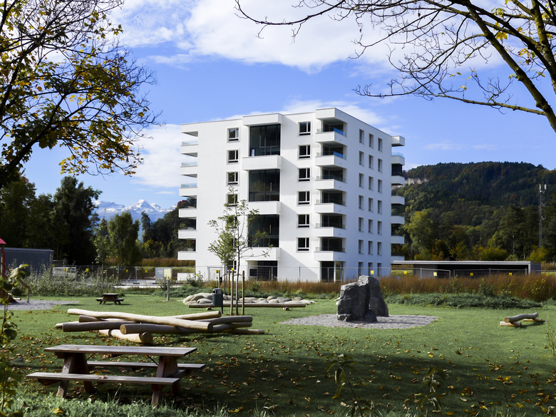 Für das Gelände einer ehemaligen Spinnerei an der Ill und ausgehend von einem Nahversorgungszentrum wurde ein städtebaulicher Masterplan entwickelt: Längs- und Punktbauten wechseln einander ab, die Finger der Längsbauten zeigen auf einen zentralen Platz, es entsteht eine Verflechtung von Grünräumen, befestigten Bereichen und Wegen, die das Areal über seine ganze Länge erschließen. Die Sockelgeschosse haben größere Raumhöhen als die Wohnungen darüber, um Flexibilität zu gewährleisten. Hier können auch Geschäfte oder Cafés sein – mit jeweils einem direkten Zugang vom leicht erhöhten Vorgarten auf den Platz. Die Wohnanlage ist auf langfristige und veränderbare Nutzung ausgelegt, die städtebauliche Konfiguration zielt ebenso darauf ab wie die dauerhafte Bauweise aus monolithischen Ziegeln.