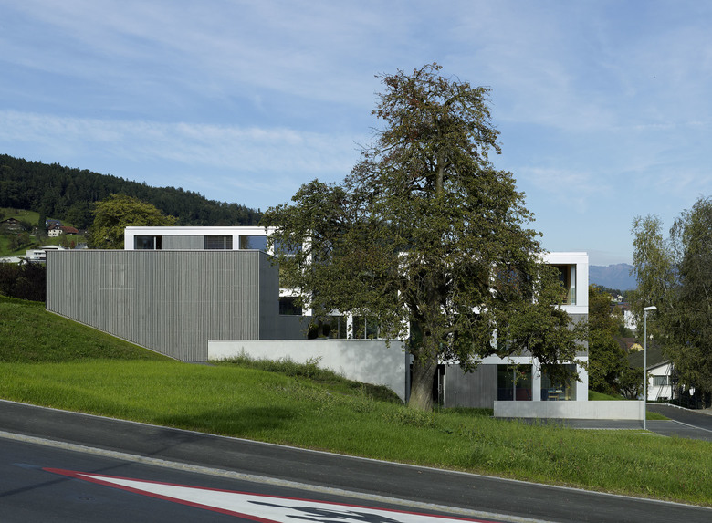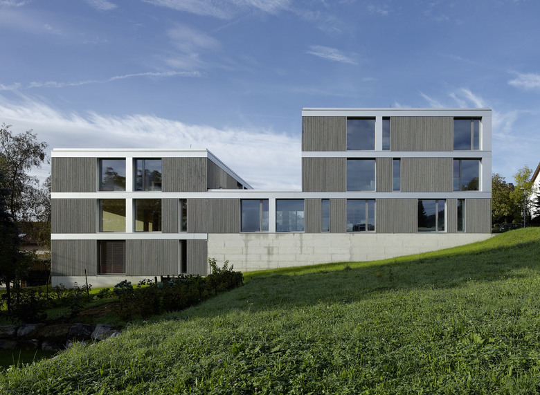 Es ist nicht einfach ein Haus, und es ist auch nicht einfach entworfen worden. Ein kleiner Wettbewerb gab die Richtung vor: Gohm & Hiessberger konnten mit ihrer Differenzierung der Baumassen am Hang überzeugen. Die drei Wohnungen der Geschwister setzen die Akzente der Wohnanlage mit sieben weiteren Einheiten und Tiefgarage. Mal eingeschoßig, mal über zwei Geschoße gehend, sind es auf die drei Geschwister genau zugeschnittene Gebilde mit ganz individuellen Außenräumen: Garten, Hof, Loggia.