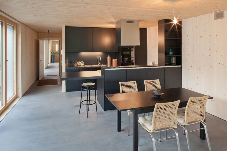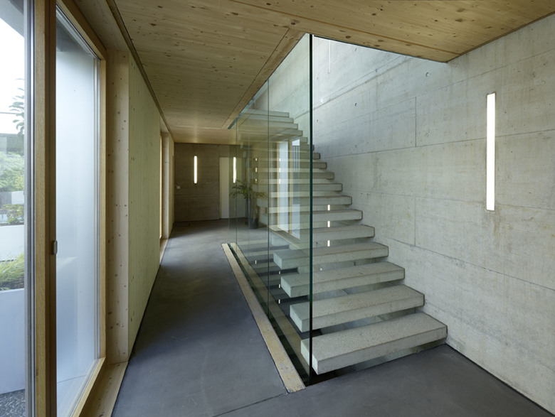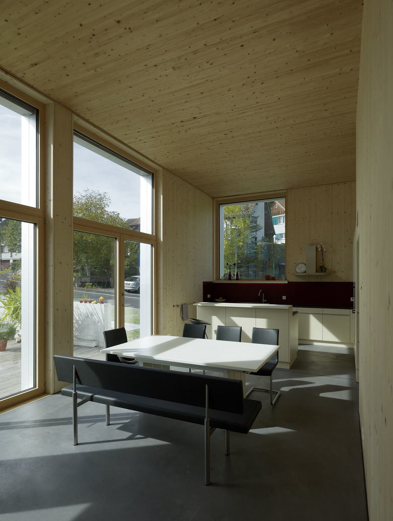 Intensiv erörterten Architekten und Bauherrschaft die räumliche Qualität. Nun sind alle Räume mit dunkelgrauem, versiegeltem Estrich versehen, die Decken zeigen die Brettstapelkonstruktion, die Wände die Fichte-Verbundplatten der ca. 50 cm starken, hochgedämmten Fertigwände. Holz-Fenster dreifachverglast, außen Alu-verkleidet.
