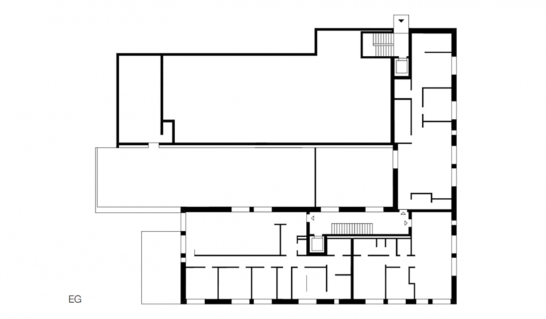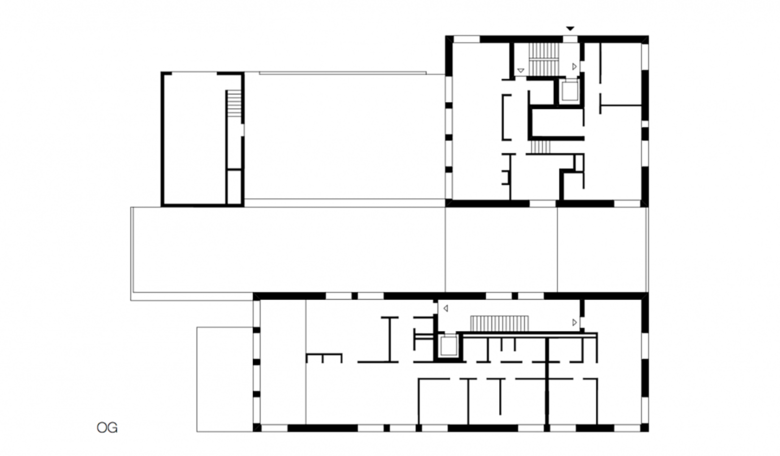 Es ist eine geometrische Komposition aus drei Körpern, die einem begegnet – differenziertes Volumen, wohlproportioniert. Auf quadratischer Grundfigur talseitig ein dreigeschoßiger Riegel. An der Ecke oben am Hang ein ebenso hoher Turm auf annähernd quadratischem Grund, gegenüber, etwas versetzt, ein geschlossener Kubus für Nebenräume. Dazwischen höhenversetzt Garten und Höfe.