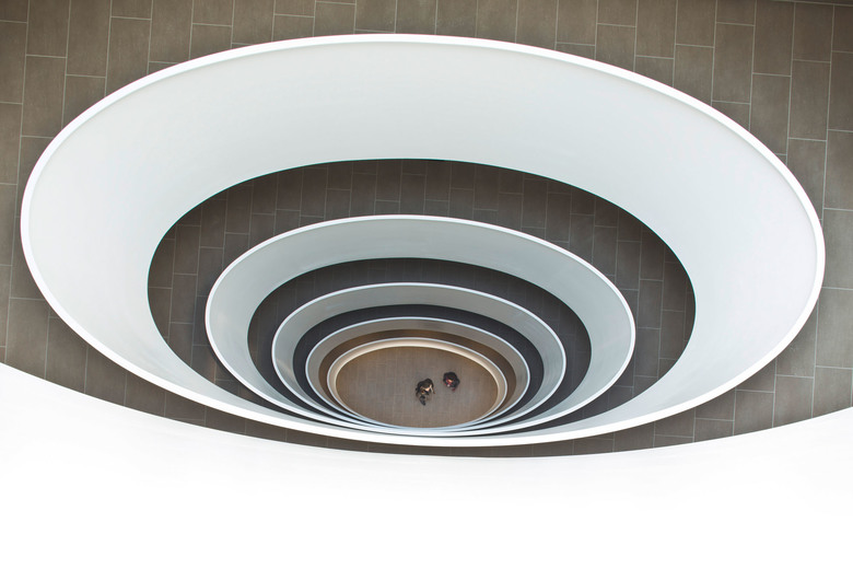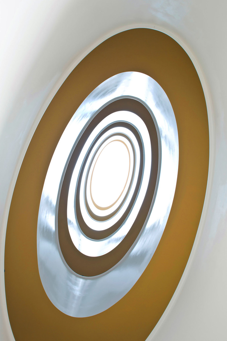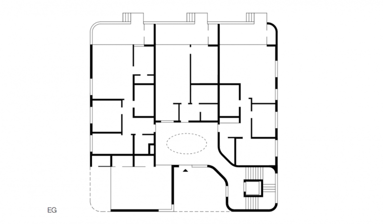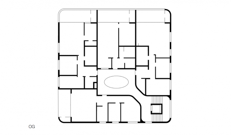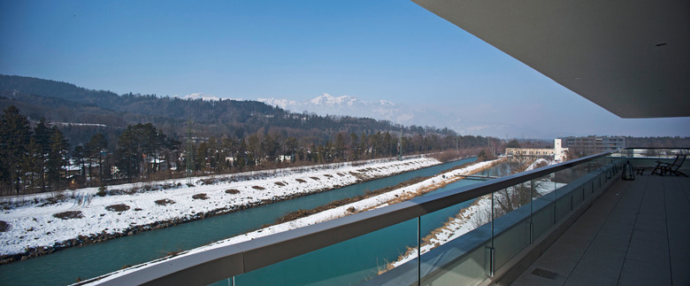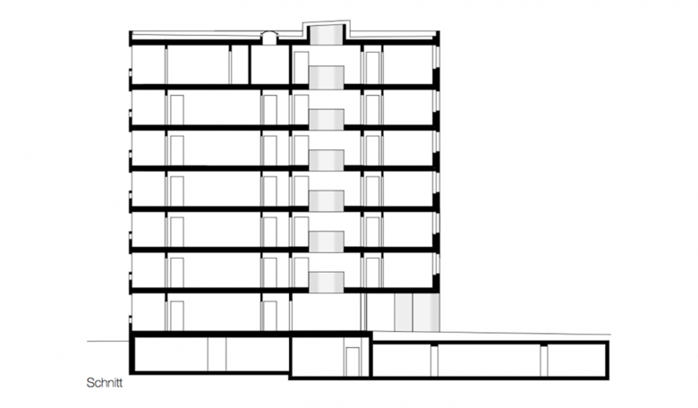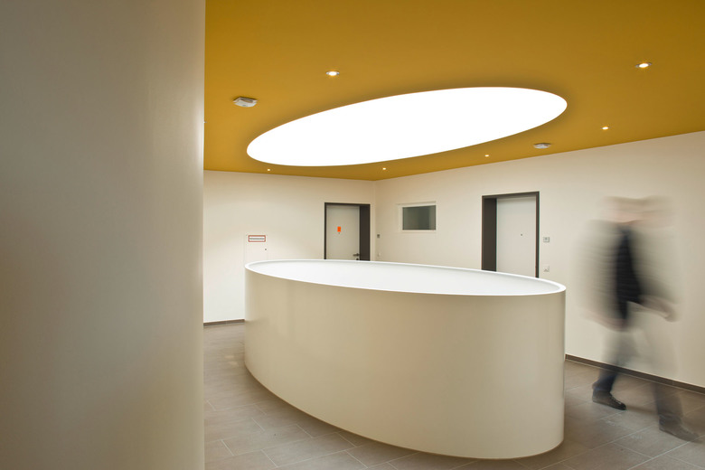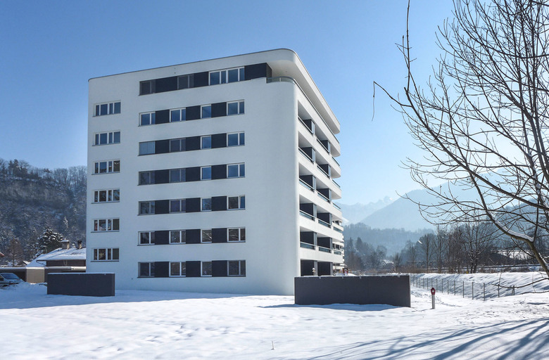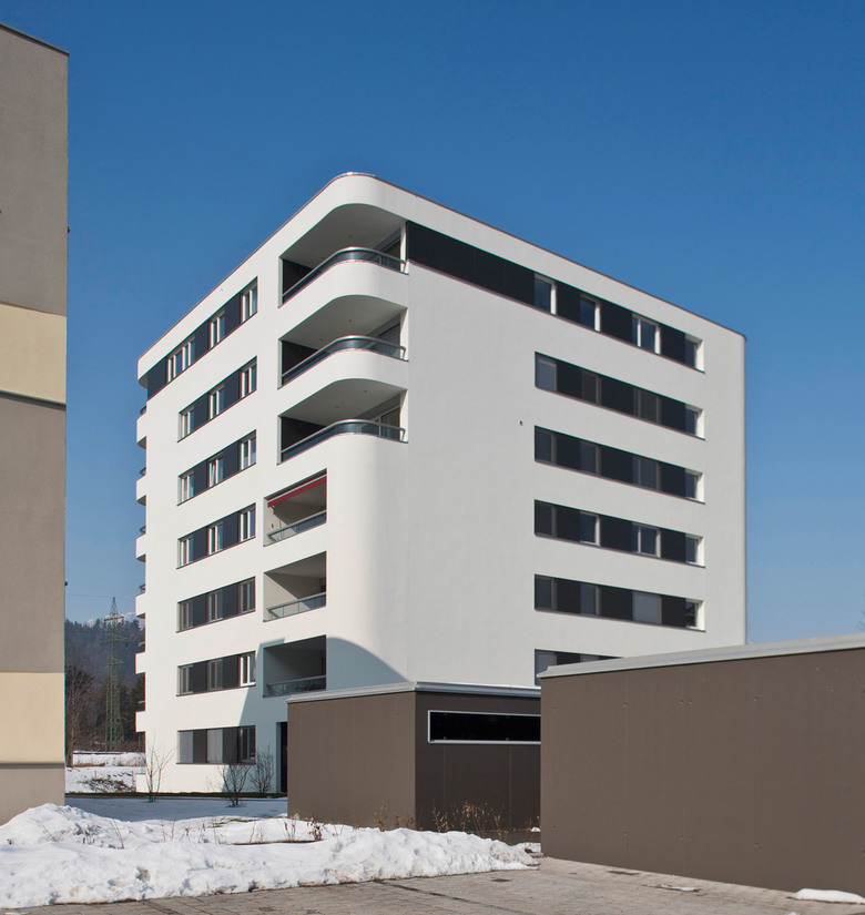 Alle Wohnungen im Haus E sind nach Südwesten orientiert. Das siebengeschossige Wohngebäude wurde als sogenanntes „Punkthaus“ - alle Wohnungen gehen aus von einem zentralen, Treppenhaus und Aufzug enthaltenden Raum - geplant. Es entsteht dadurch eine Halle, die sich über alle Geschosse zieht und über das Dach von oben belichtet wird. Die Ellipsenform des zentralen Luftraums und der Brüstung sorgt für die besondere Optik. Die farbigen Deckenuntersichten im Stiegenhaus und Zentralraum erzeugen je nach Blickwinkel spannende Kontraste. Die Abrundung der äußeren Gebäudeecken setzt sich im Inneren im Bereich des Stiegenhauses fort. Bei den Balkonen wurden die Brüstungen bewußt auf 70 Zentimeter Höhe reduziert und mit einem oberen Glasband versehen, um auch hier den Bezug zum Wasser und der umliegenden Bergwelt herzustellen.