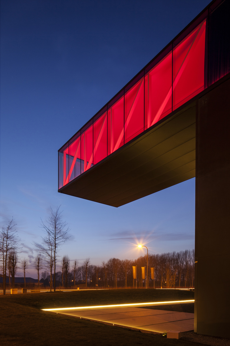 The industrial building is mainly a hall for production and storage, but also contains the office spaces. A cantilevered volume containing the meeting room is located at the top corner of the building. The facade is further characterized by printing a stylized image of the beautiful treeline along the canal “Damse Vaart” on the prefab slabs through the application of the Graphic Concrete procedure. This creates an interesting interaction between the building and its surroundings, as the building reflects the nature across the street and canal.