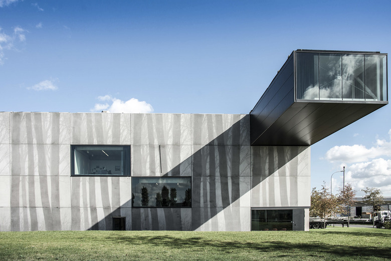 The new headquarters for Enjoy Concrete are a showcase for its products, constructed entirely out of prefabricated concrete elements. Its facades are concrete slabs of 6 by 3 meters and all windows share these same proportions.