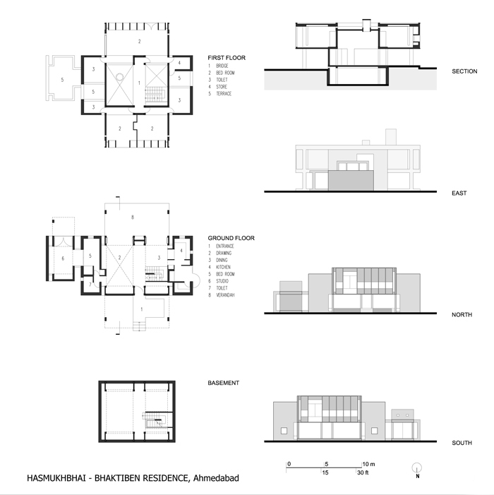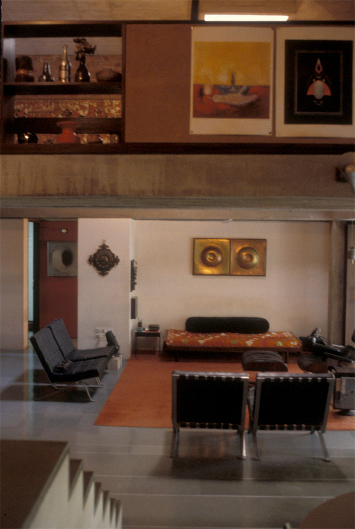 With the built up area of 375 sq.m., the house was designed for a family of 4 and remains one of the most cherished projects. In the case of his own house, the architect had to bring about a synthesis of the requirements of a Gujarati household and aesthetics which would appeal to the residents of the house.