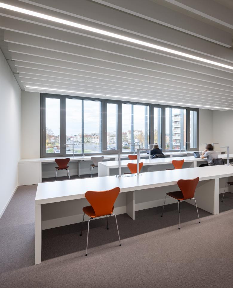 Im Bestandsbauteil LG4 der Bibliothek werden die meisten Flächen für Freihandregale vorgesehen. Die Arbeits- und Leseplätze dagegen werden überwiegend den Fenstern im Erweiterungsneubau zugeordnet. Es sind offene Nutzerbereiche entstanden, die konzentriertes oder kommunikatives Arbeiten ermöglichen. Die Studierenden finden offene Arbeitsbereiche in Tischgruppen und Reihenarbeitsplätze oder abgeschlossene Arbeitskabinen / Carrels.