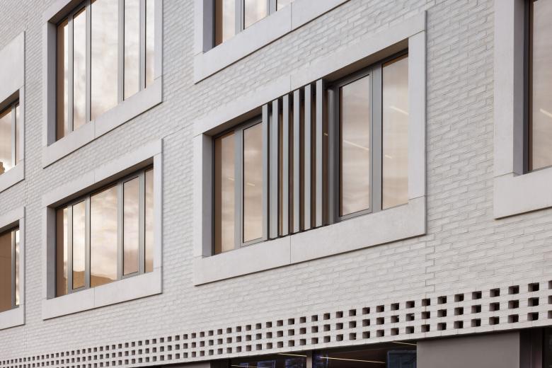 Der Materialkanon aus den bestehenden Hochschulgebäuden wird aufgenommen und modifiziert. Entsprechend bekleiden die tragenden Außenfassaden Ziegelsteinen bekleidet mit hell geschlämmten Oberflächen. Die Fassadenöffnungen erhalten dagegen glatt geputzte Umrahmungen und Aluminiumfenster mit feststehendem Sonnenschutz aus mandarinfarbenem Metallgewebe im Scheibenzwischenraum.