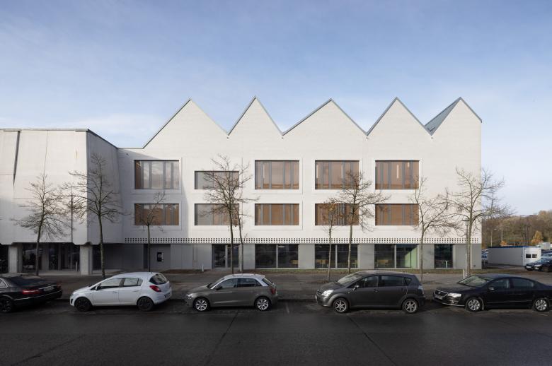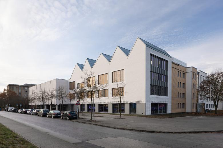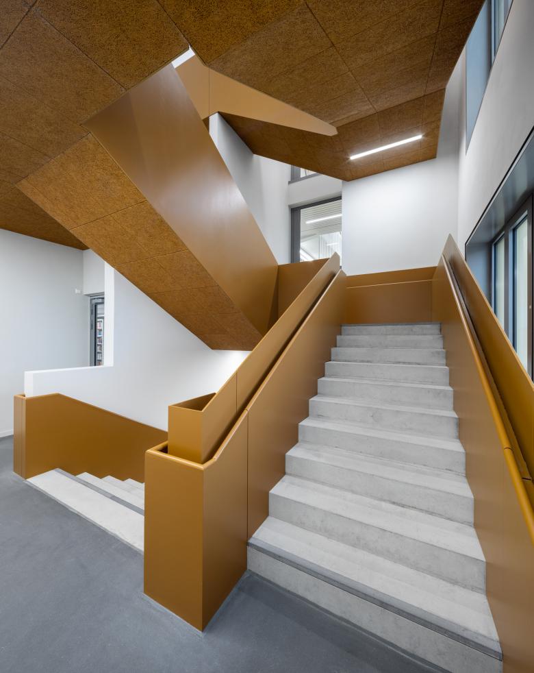 Der viergeschossige Erweiterungsneubau schließt direkt an die Bestandsbauteile an und wird mit diesen über Wege- und Blickbezüge verbunden. Die Hierarchisierung der Nutzungen erfolgt entsprechend der zu erwartenden Nutzungsintensität von „offen nach intern“ bzw. von „Kommunikation nach Konzentration“.