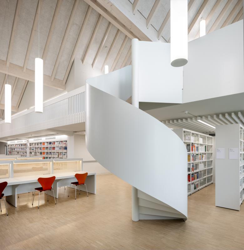 Unter der Dachlandschaft befindet sich der zweigeschossige Lesesaal mit Galerie und Bücherwand – ein besonderer, identifikationstiftender Raum.