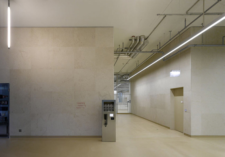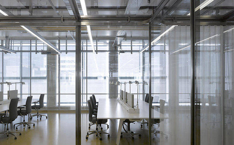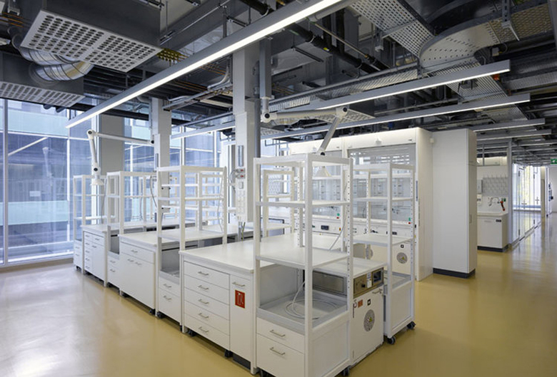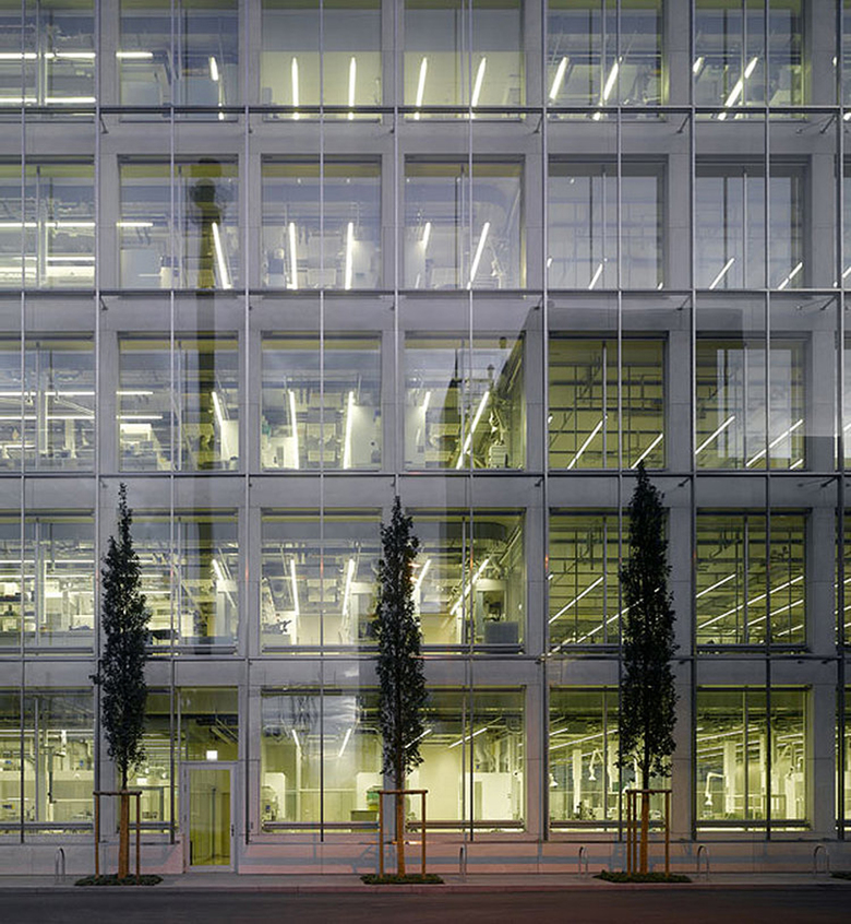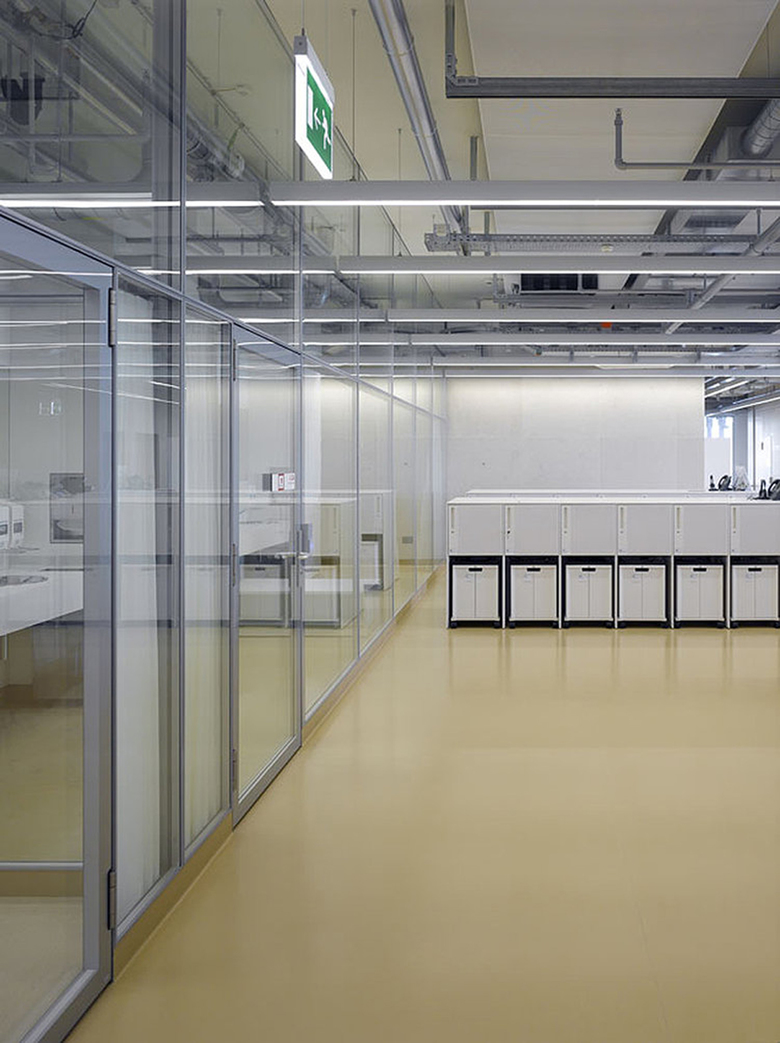 Auf die Mitten der Fassadenelemente orientiert können sowohl komplexe Einrichtung der Labormöblierung wie auch die grosszügigen Open-Space Büroflächen mit einfachsten Linien zu einem architektonischen Thema zusammengefasst werden. Die Lichtlinien beginnen und enden exakt auf architektonischen Gegebenheiten und sind untereinander in ein ganzheitliches Gefüge eingepasst.