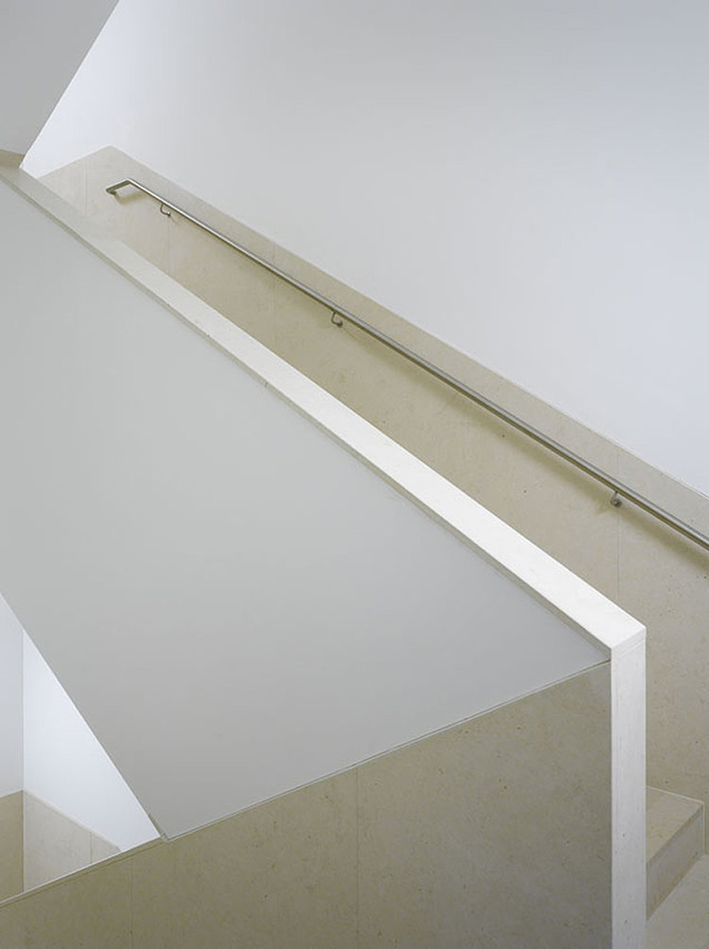Die Beleuchtung in den Treppenhäusern wird mit Wandaufbauleuchten gelöst, die die Handschrift von Alvaro Siza tragen.