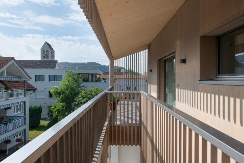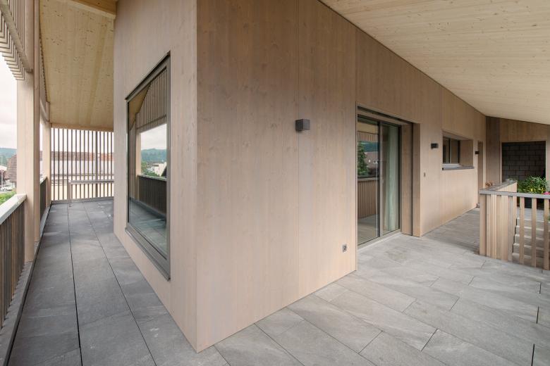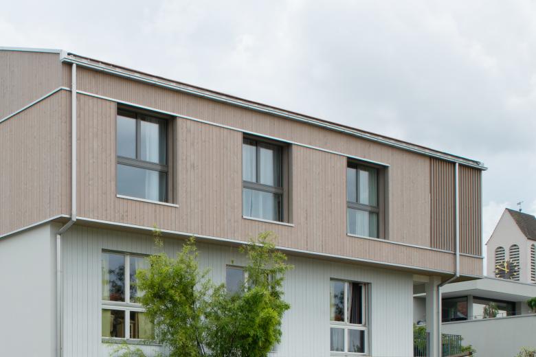 Bewusst soll die hybride Bauweise, das heisst der Bestand in Massivbau und die Aufstockung in Holzbau, erlebbar gemacht werden. Zugleich verbindet der vertikale Holzfilter beim Treppenlauf gemeinsam mit dem überdachten Carport die Fassade zu einem stimmigen Ganzen. Das architektonische Konzept ist eine moderne Interpretation der im Schweizer Mittelland verbreiteten Bauernhaustypologie mit den aussenliegenden Treppen und Veranden.