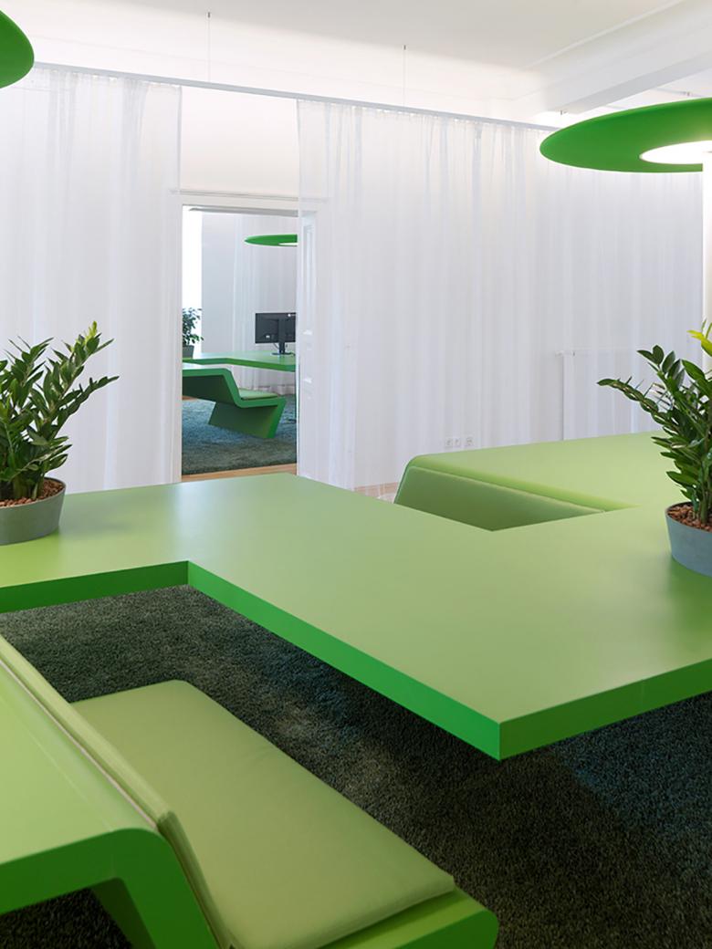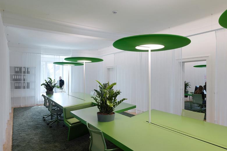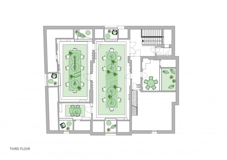 In der obersten Arbeitsetage liegt der Fokus auf der Farbe Grün, mit dem Ziel eine stille und konzentrierte Atmosphäre zu schaffen. Schallabsorbierende Vorhänge umschließen die Inseln und bieten einen Kontrast zu schallharten Elementen, während ein weiteres flexibles Raummöbel als Schreibtisch sowie als Sitzbank dient. Die Inspirationsquelle der Biophilie wird durch die großzügige Pflanzenvielfalt und dynamisches Licht verdeutlicht.
