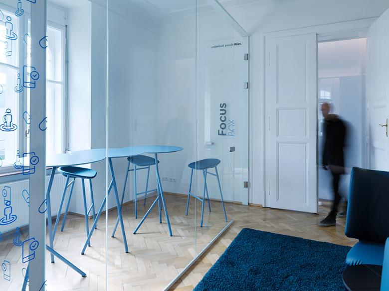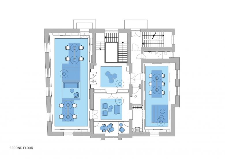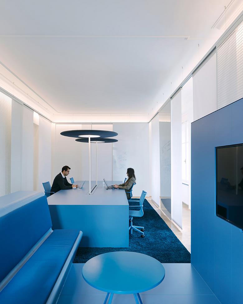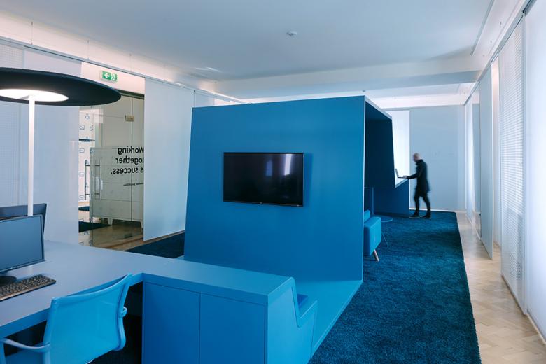 Durch das zweite Geschoss zieht sich die Farbe Blau, welche nicht nur Zusammenarbeit und Produktivität steigert, sondern sich auch positiv auf die Ideenfindung auswirkt und kreative Prozesse fördert. Die zwei Hauptinseln mit flexiblem Möbelsystem und Gruppenarbeitsbereichen regen zur Teamarbeit und Interaktion an. Bewegliche Screens, die als Pinnwand, White Board oder Akustikpanel dienen, lockern entlang der Bestandswände die architektonischen Strukturen auf. Durch eine der Inseln zieht sich raumfüllend ein Möbelband, das nacheinander Schreibtisch, Wand, Decke, Boden und Couch formt.