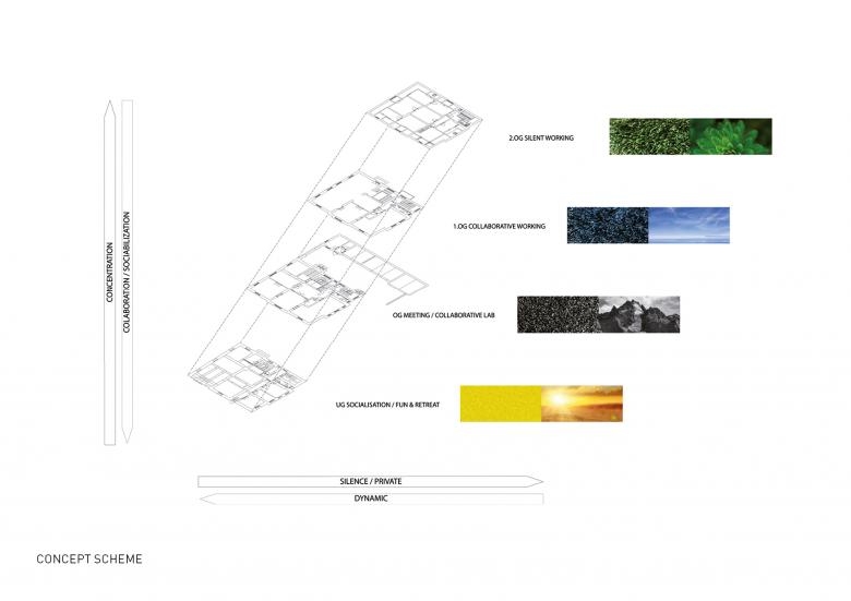 Aufsteigend vom Souterrain zum obersten Geschoss, verändert sich die Raumatmosphäre graduell von gemeinschaftlich, kollaborativen bis hin zu ruhigen und fokussierten Arbeitsplätzen. Dieses Prinzip wird durch den strategischen Einsatz von Farbpsychologie vertieft. Gelb, Grau, Blau und Grün werden den Stockwerken funktionell zugeordnet, um dort bestimmte Emotionen zu verstärken und somit die gewünschte Arbeitsatmosphäre zu unterstützen.