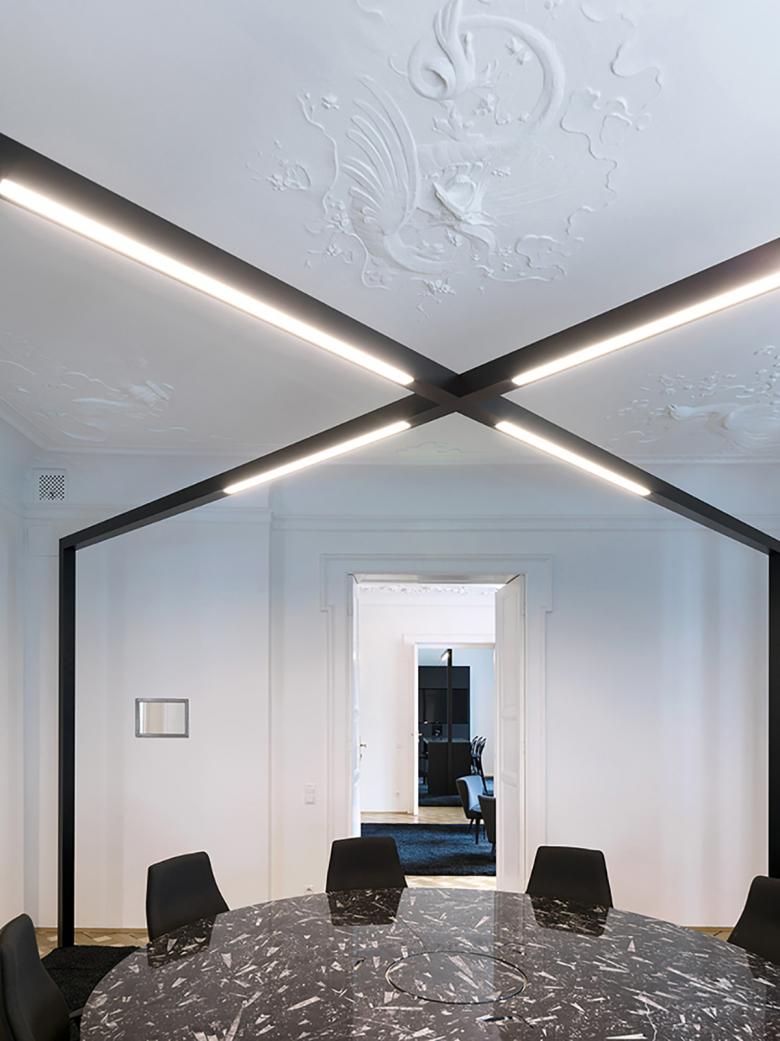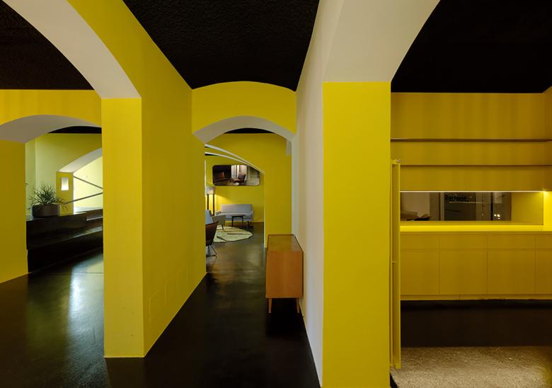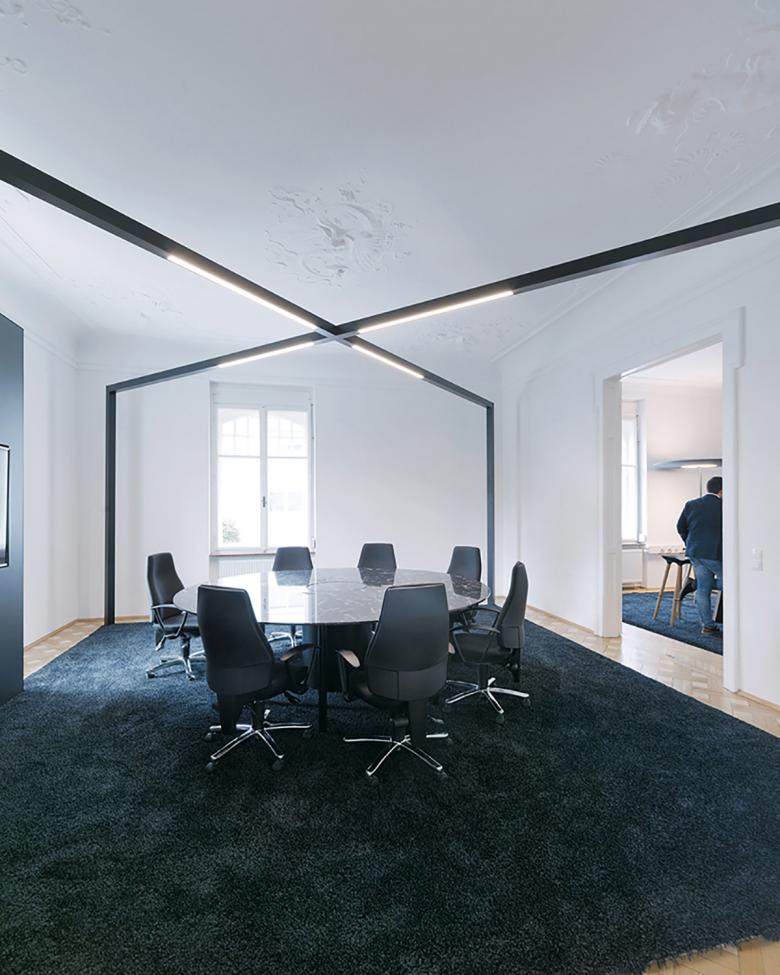 Eine weitere Intervention unseres primären Designkonzepts stellen durch Teppichzonen definierte monochromatische Inseln dar, auf denen die neuen Elemente platziert werden und ermöglichen, den historischen Bestand zu erhalten und sogar hervorzuheben. Bestehende Wände, Türen, Böden und die Struktur des Gebäudes bleiben unberührt, werden jedoch durch moderne Einbauten im Rahmen der Inseln ergänzt. Daraus resultiert eine Raumserie mit autarken, funktionalen und vielfältig Zonen, welche bestimmten Arbeitsphasen gewidmet sind.