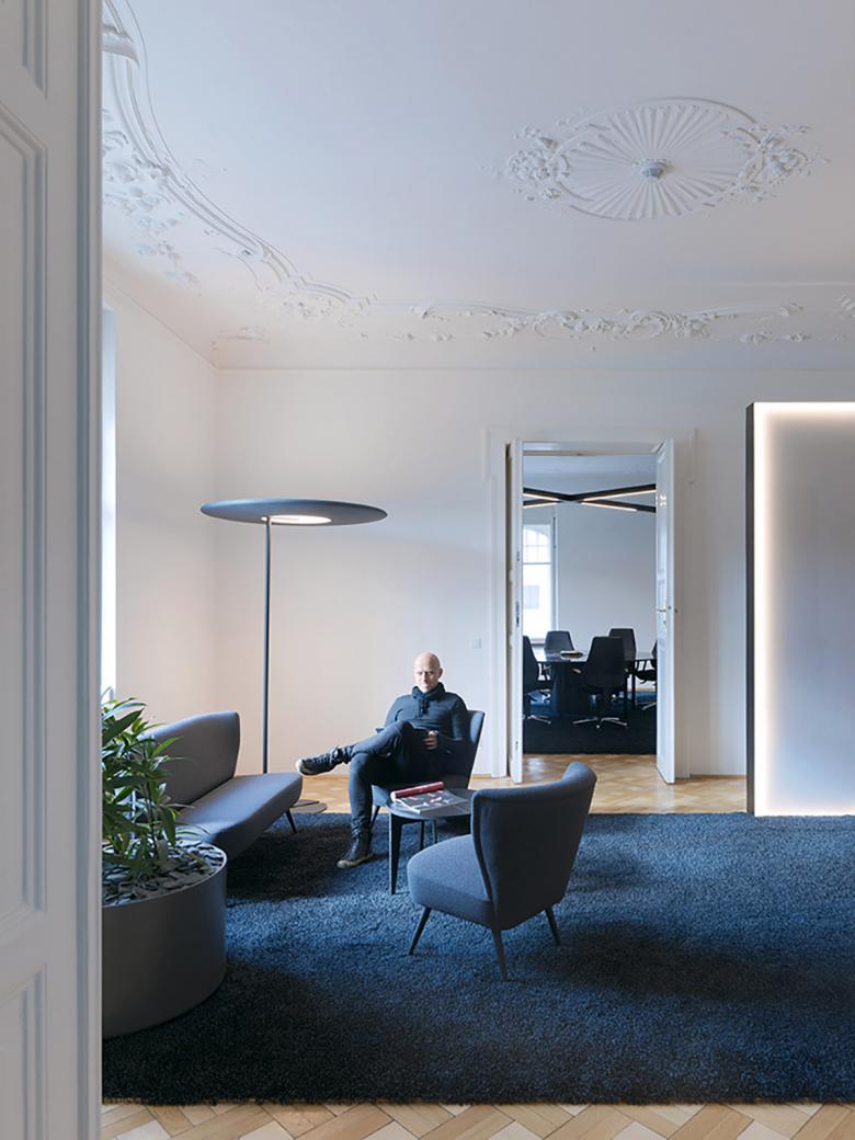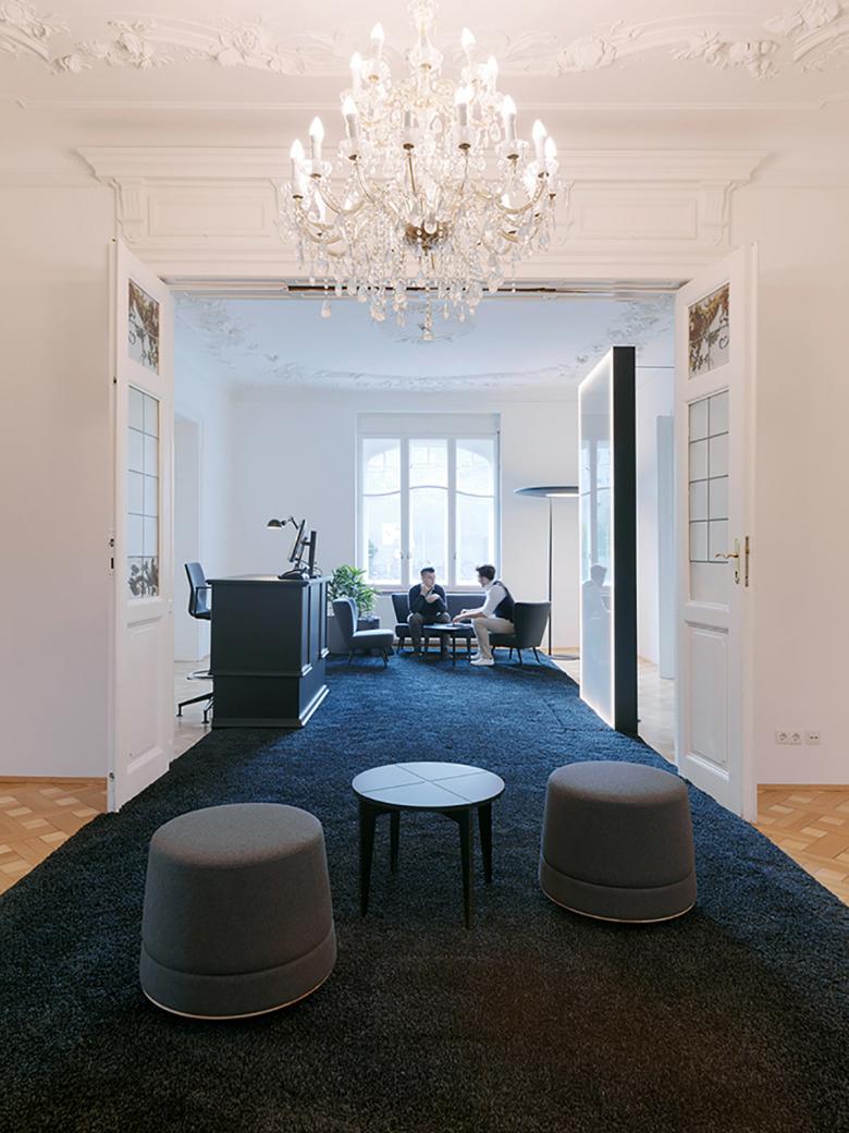 Das Parterre mit seinem Empfangsbereich, Besprechungsräumen und Lounges ist in einem eleganten Dunkelgrau gehalten. Neu interpretierte antike Möbel und maßangefertigte Leuchtelemente schaffen hier eine Balance zur denkmalgeschützten Stuckdecke.