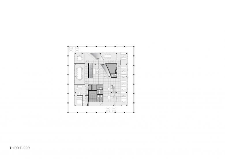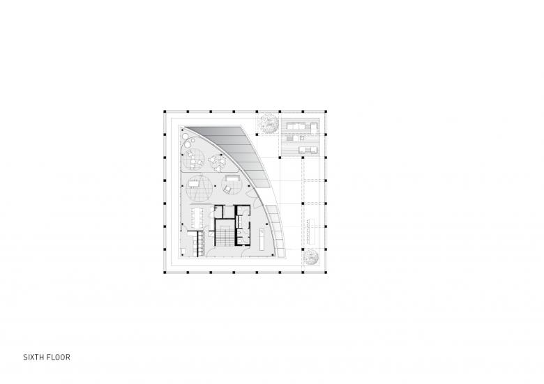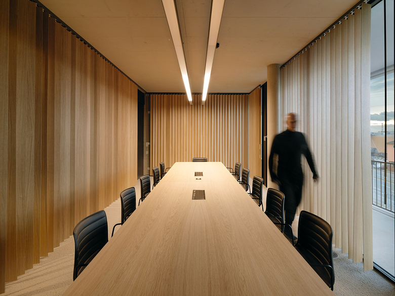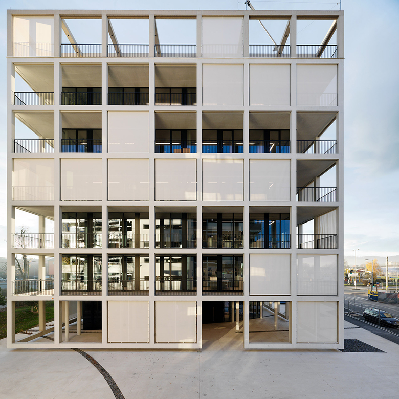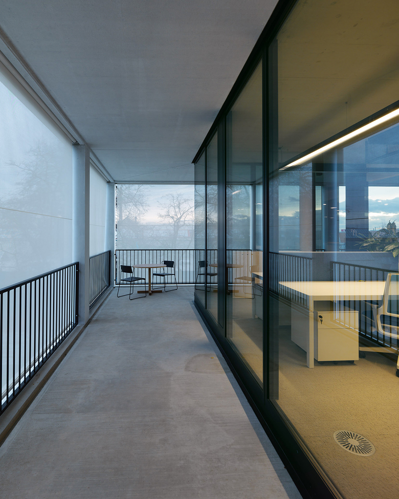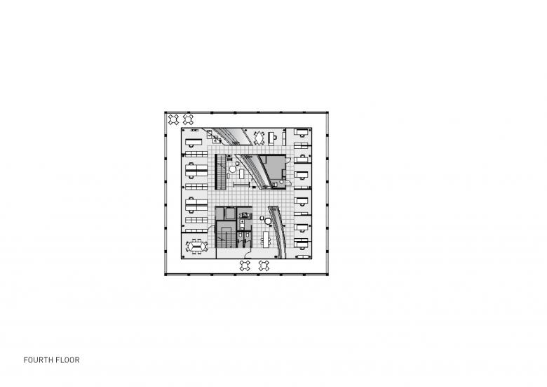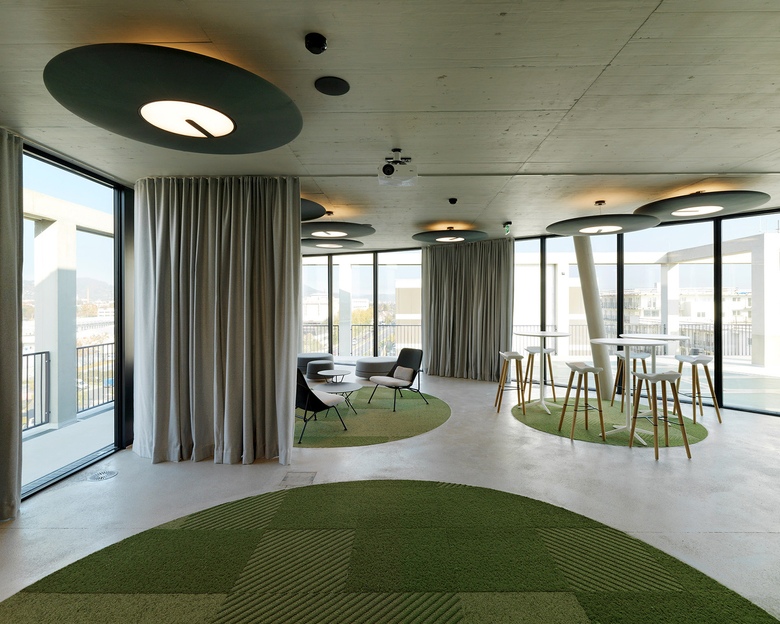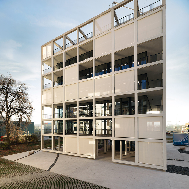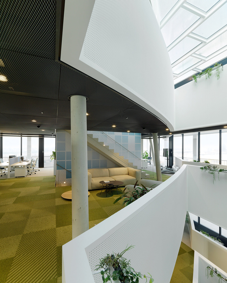 Zwischen dem symmetrischen Fassadenraster und dem transparenten Bürogebäude entstehen auf jedem Geschoss rund umlaufende, individuell verwendbare Freibereiche. Das Erscheinungsbild des Gebäudes verändert sich durch textile Sonnenblenden, welche die Dynamik des Tageslichts und der Nutzer abbilden. Die innenräumliche Gestaltung reflektiert das „New Work“ Konzept, dessen Funktionen, wie gemeinsam genutzte Einrichtungen sowie Arbeits- und Rückzugsorte, um den sich konisch erweiternden Lichthof, als vertikalen Kommunikationsraum vom Erdgeschoss bis zum Dachgarten, organisiert sind.