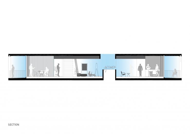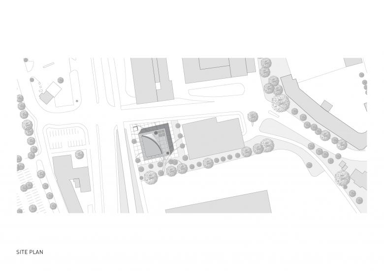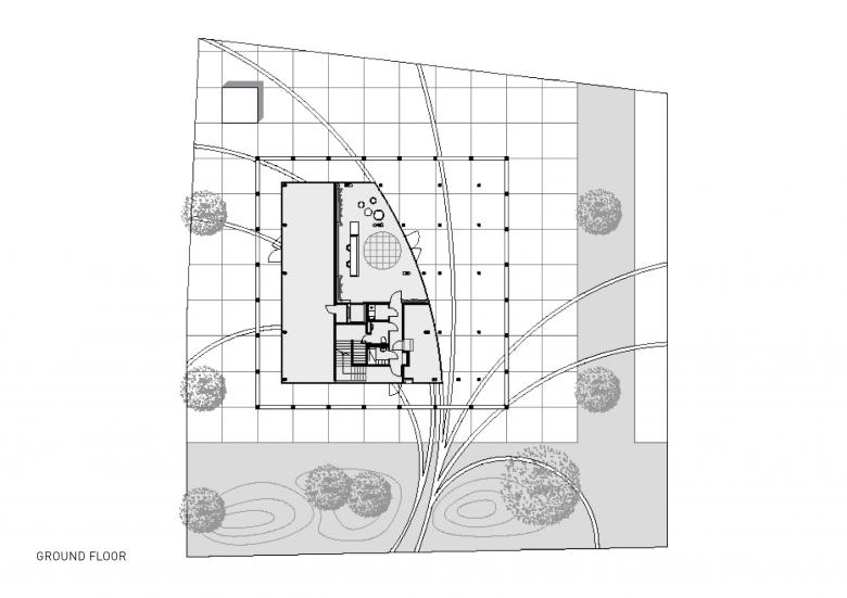 Das würfelförmige Bauwerk besteht aus einer schwebenden Betonkonstruktion und einem darin eingebetteten, gläsernen Kern, der von einem sich nach oben öffnendem Atrium durchzogen ist.