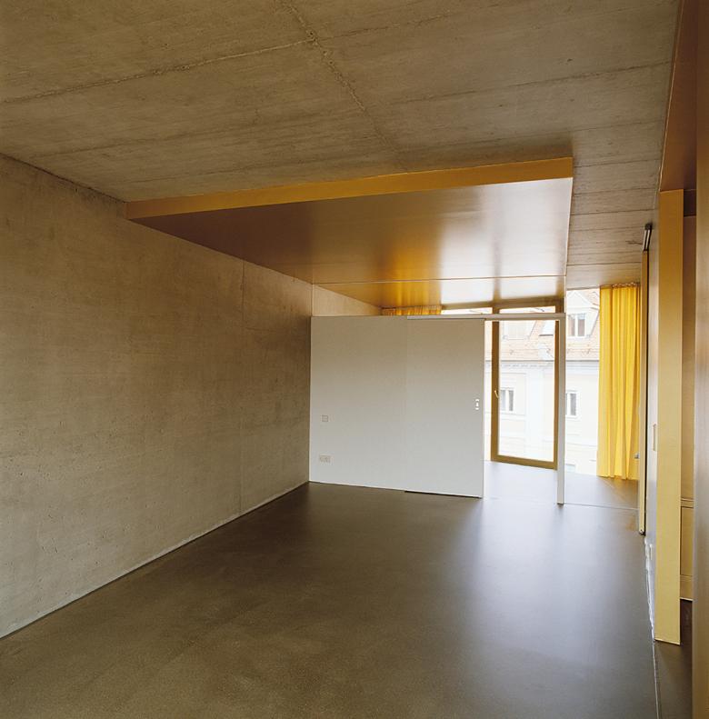 Die ersten drei Ebenen beherbergen die Büroflächen von INNOCAD und 13&9 Design mit fünf Wohnungen in den Obergeschossen. Die nach innen gerichteten, geschlossenen Bereiche werden durch ihre Geschichten zu einem komplexen Körper verbunden, der zwischen den Brandwänden schwebt.