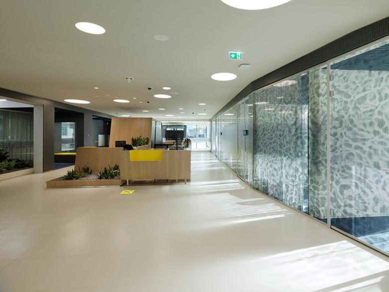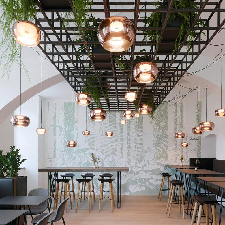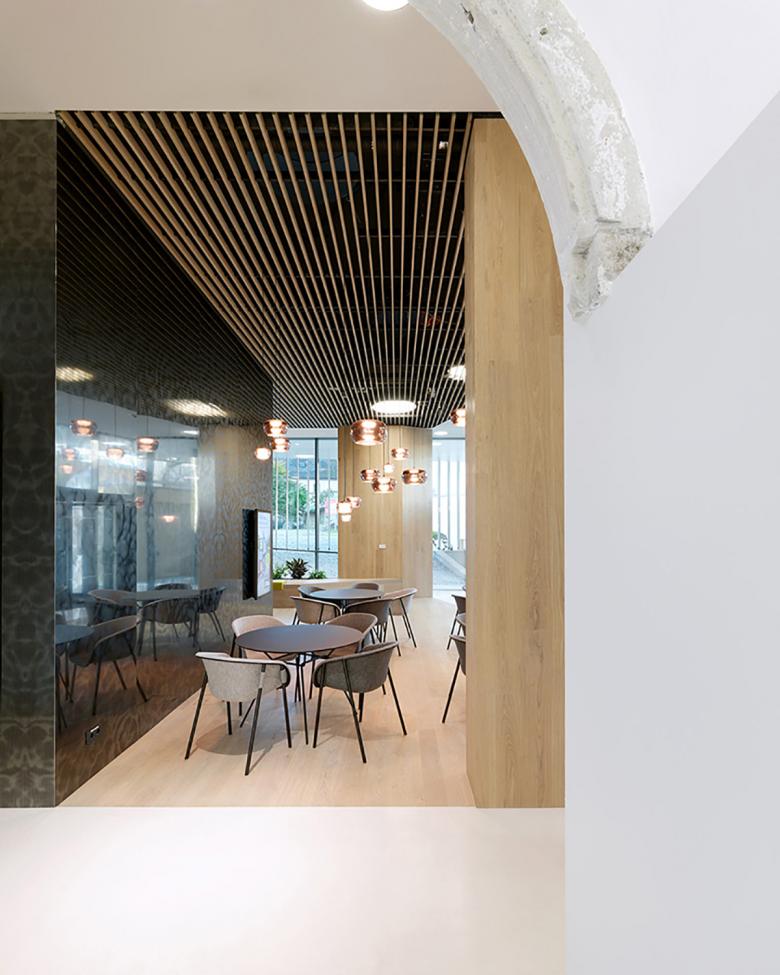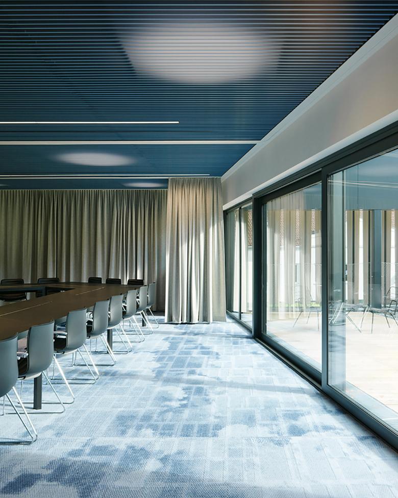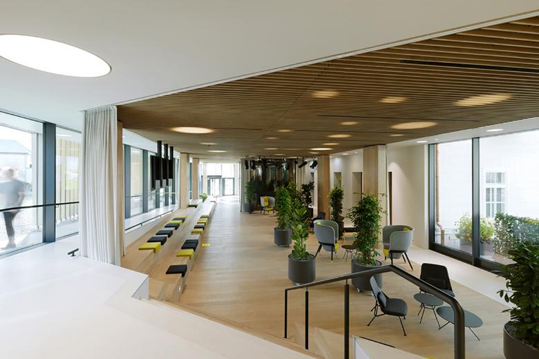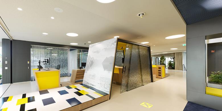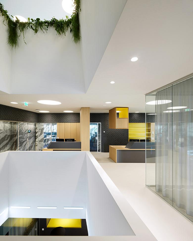 Funktional präsentiert sich das vielseitige, dynamische und innovative Gebäude als eine Art „Stadtmöbel“ und geht weit über das Raumprogramm einer traditionellen Bank hinaus. Es beherbergt neben den Büroflächen einen großen öffentlichen Bereich mit Café und Restaurant im Erdgeschoss, zusätzliche Räumlichkeiten für Dienstleister, einen Dachgarten und einen Coworking Space. Das multifunktionale Forum bildet das Zentrum für Begegnung und Interaktion zwischen Kunden, Besuchern, Büroangestellten, Bankmitgliedern und der Öffentlichkeit. Ein maßgeschneiderter Empfangsbereich mit biophilen Komponenten und Kaffeebar komplettiert das einmalige Kundenerlebnis. Das Volumen des dreistöckigen Neubaus wird von einem Luftraum durchschnitten, der die Geschosse visuell und als vertikalen Kommunikationsraum verknüpft. Bedruckte Glasflächen ermöglichen in den Büroräumen gleichzeitig Privatheit und einen mit Tageslicht belichteten Arbeitsplatz. Rückzugsbereiche für Vertrauliches sind über das ganze Objekt verteilt und unterstreichen mit textilen Elementen deren diskrete Funktionalität.