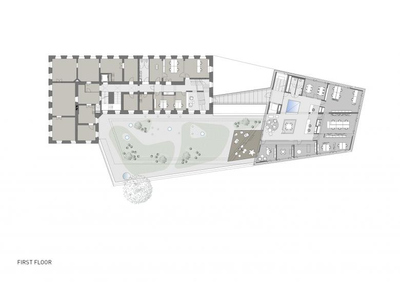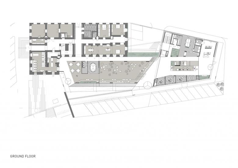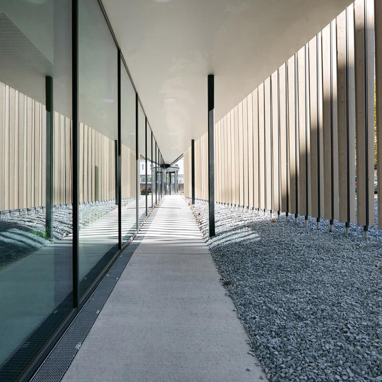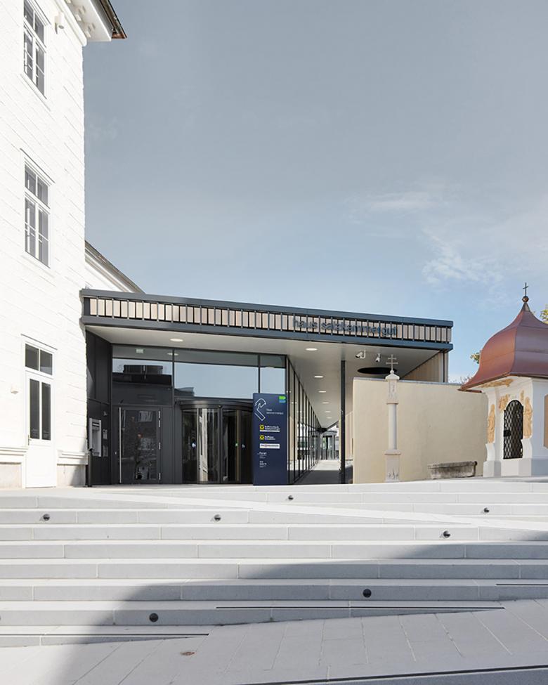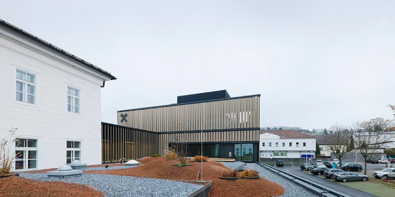 Räumlich führt die Form des Neubaus bestehende städtebauliche Achsen sowie Flucht- und Höhenlinien des denkmalgeschützten Bestands, einem ehemaligen Forstamt aus der ersten Hälfte des 19. Jahrhunderts, fort und schafft eine Verbindung des neuen Gebäudeteils zum städtebaulichen und historischen Kontext. Das neue dreistöckige Zentrum der Raiffeisenbank Salzkammergut und der historische Bau werden durch ein flaches Volumen mit Dachgarten verbunden, der an die steinigen Seeufer und die Gebirgslandschaft Gmundens erinnert. Eine hölzerne, lamellierte Fußgängerbrücke, mit wechselndem Licht-Schatten-Spiel, gewährt Ausblicke auf den Dachgarten und verknüpft den neuen multifunktionellen Komplex mit dem Forstamt. Durch eine großzügig angelegte Rampe, die sich von der Straße bis zum Gebäude erstreckt, vereint sich die Anlage optisch und räumlich mit der Stadt. Der entstehende, öffentlichen Platz führt die Besucher zum Haupteingang. Ein überdachter, außenliegender Korridor, der sich vom Platz aus an der Südseite entlangzieht, schließt die beiden Straßen zusammen, die das Grundstück im Osten und Westen eingrenzen.