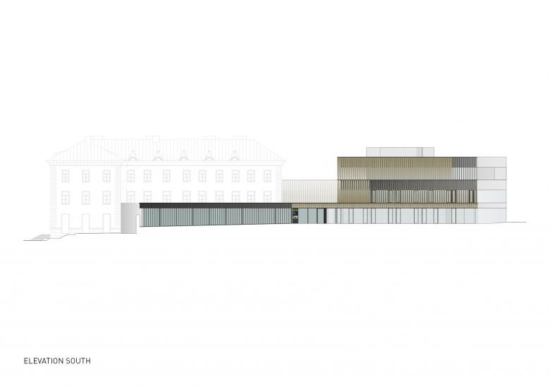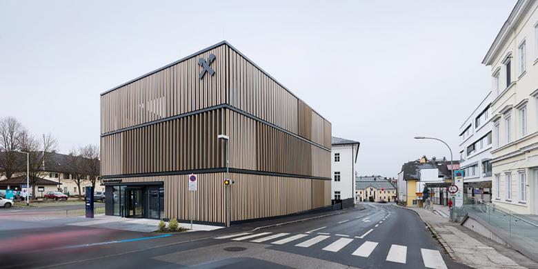 Die Materialität spielt bei diesem Projekt eine zentrale Rolle, da diese die Werte des Kunden und die Atmosphäre, der an einem See gelegenen Stadt in den Alpen, vereint. Die Elemente Wasser, Stein und Himmel ziehen sich thematisch durch alle drei Stockwerke des Anbaus. Für die Gebäudehülle wurde Holz mit reduzierter, architektonischer Sprache verwendet, zurückhaltend in der Materialität aber dynamisch in der Formgebung. Die hölzerne Fassade ist ein direkter Verweis auf die frühere Nutzung des denkmalgeschützten Forstverwaltungsgebäudes und stellt ein Bindeglied zu den benachbarten Bauwerken sowie der Landschaft der Region Salzkammergut dar. Die teilweise beweglichen, trapezförmige Lamellen formen eine scheinbar tanzende Außenhülle. Reduzierte schwarze Details unterstreichen dabei die Markenwerte und Identität der Bank.