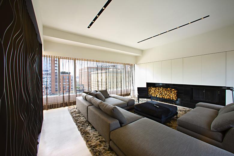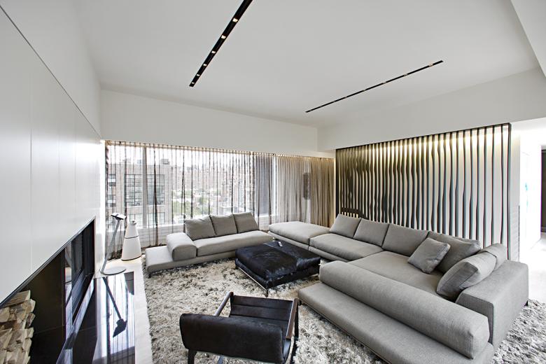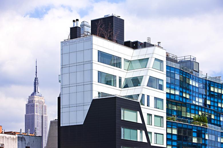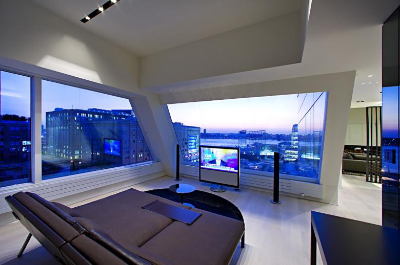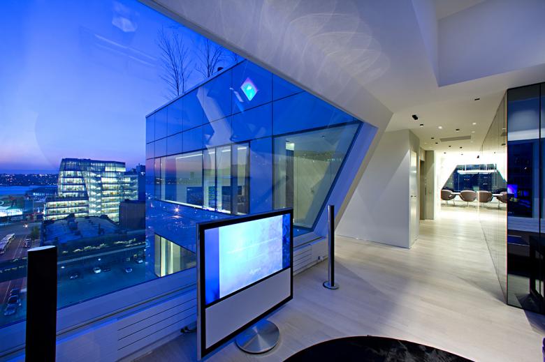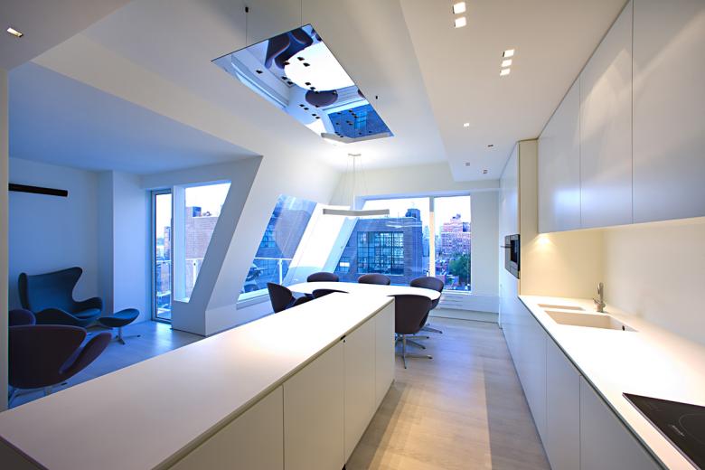 Material und Farbauswahl vermitteln sowohl Wertigkeit als auch legere Urbanität. Jeder Raum lebt vom direkten visuellen Bezug zur faszinierenden Stadtlandschaft von New York City.