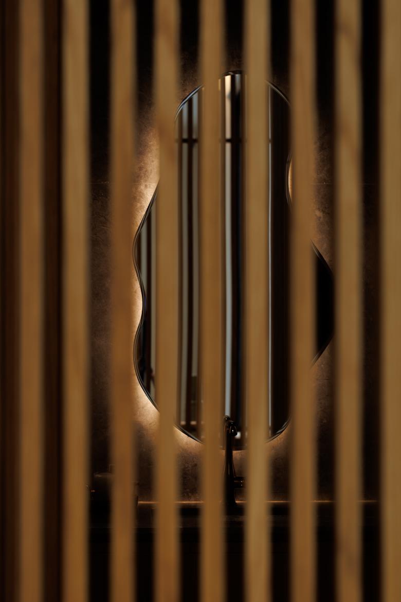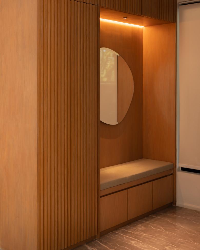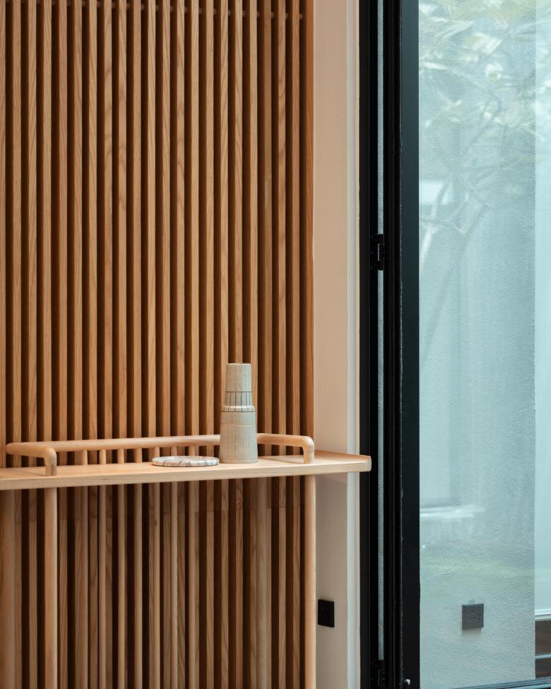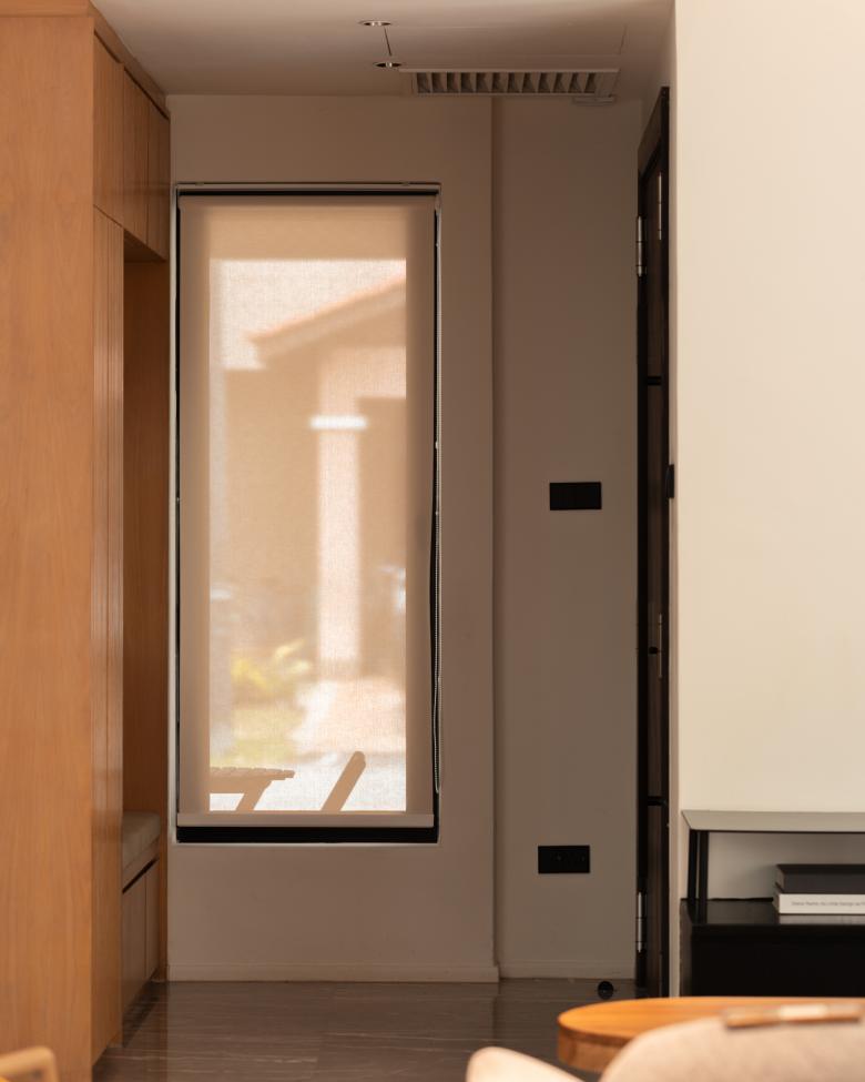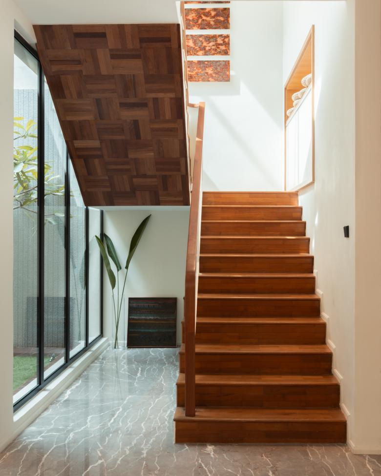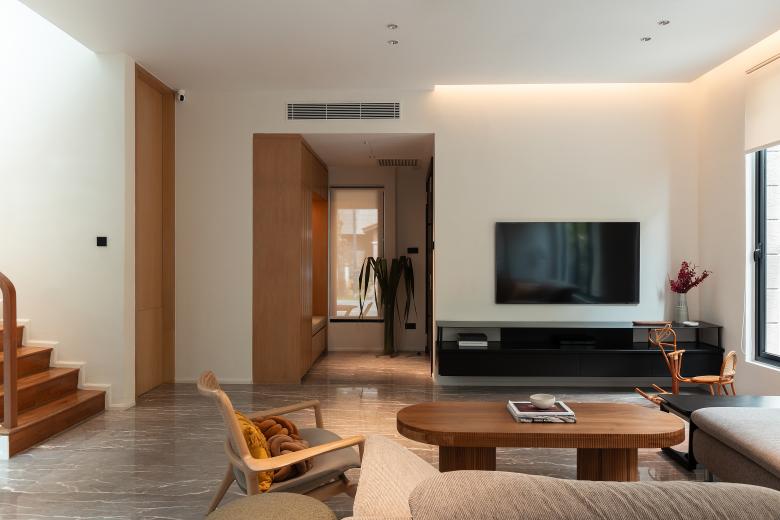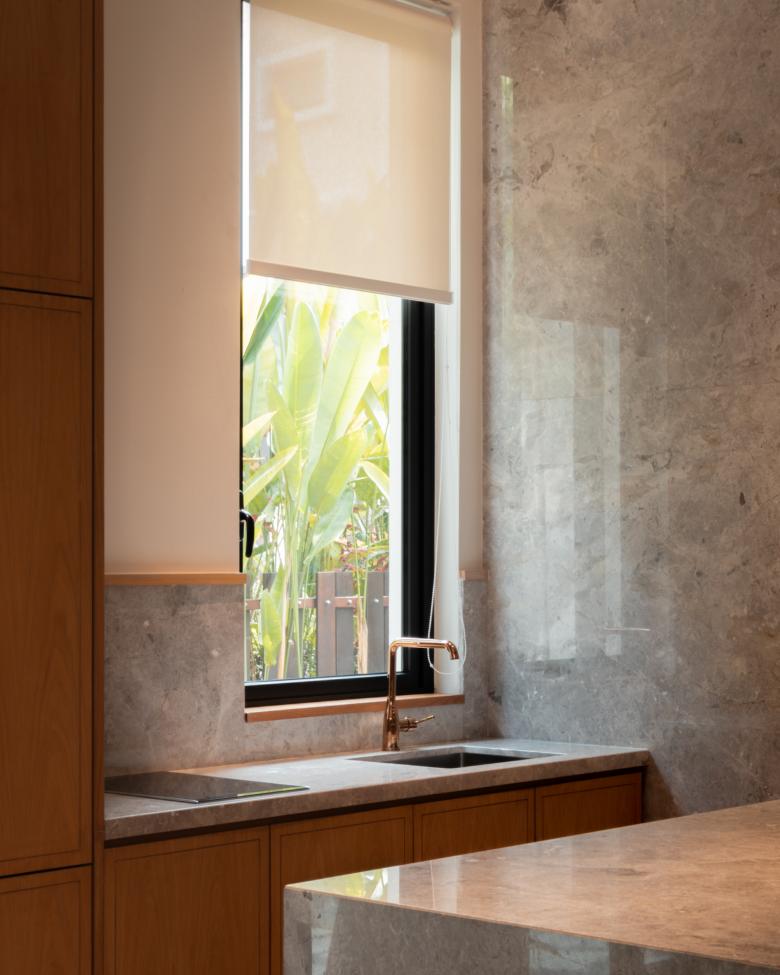 Das innenarchitektonische Konzept von Dwg Studios basiert auf einer reduzierten Materialpalette. Grau marmorierte Steinflächen, vertikale Holzlamellen und maßgefertigte Einbauten in warmen Naturtönen erzeugen eine ruhige, zeitlose Atmosphäre. Holz findet sich in vielen Details wieder – vom Möbelstück bis zur Wandverkleidung – und verleiht den modernen Linien eine weiche Haptik. Großzügige Verglasungen schaffen Sichtbeziehungen zu den grünen Außenbereichen. Transparenz, natürliche Belüftung und gezielt eingesetzte Materialien wie Stein, Holz und Textilien fördern eine angenehme Raumwirkung und ein gesundes Wohnklima. Bereits beim Betreten des Hauses fällt der kontrollierte Umgang mit Licht und Raum ins Auge.