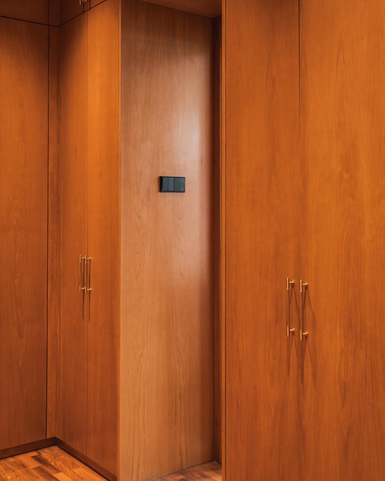 Das Lichtdesign von Studio Nimmersatt verstärkt diese Wirkung: Verdeckte LED-Leisten, gezielte Spots und dimmbare Zoneninszenierungen schaffen je nach Tageszeit unterschiedliche Raumbilder – von funktional bis stimmungsvoll. In das durchdachte Gestaltungskonzept fügen sich auch die Bedienelemente von JUNG ein. Zum Einsatz kommt die Schalterserie LS 990 in Schwarz, die sich dezent in die reduzierten Innenräume einfügt. In Bereichen mit höheren Anforderungen an Lichtsteuerung und Szenengestaltung wurden zusätzlich KNX-F-50-Taster verbaut.