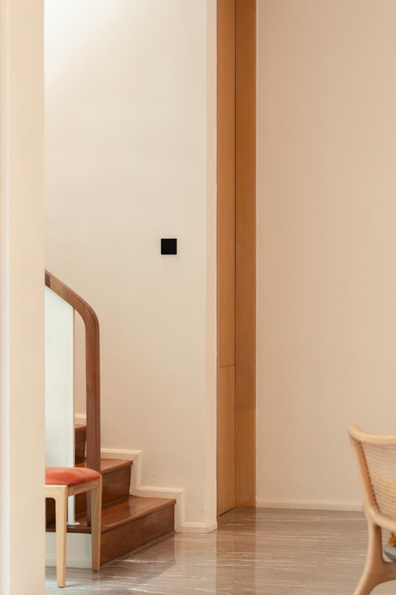 Der zweigeschossige Baukörper verbindet natürliche Materialien, Lichtführung und präzise Detaillierung zu einem harmonischen Gesamtbild. Über dem zentralen Treppenraum sorgt ein großzügiges Oberlicht für ein tageszeitabhängiges Lichtspiel. Die Holztreppe erzeugt eine warme, fast skulpturale Wirkung. Dabei ist der Treppenraum mehr als nur eine Erschließung, er wird zur Bühne für Licht und Bewegung im Alltag.