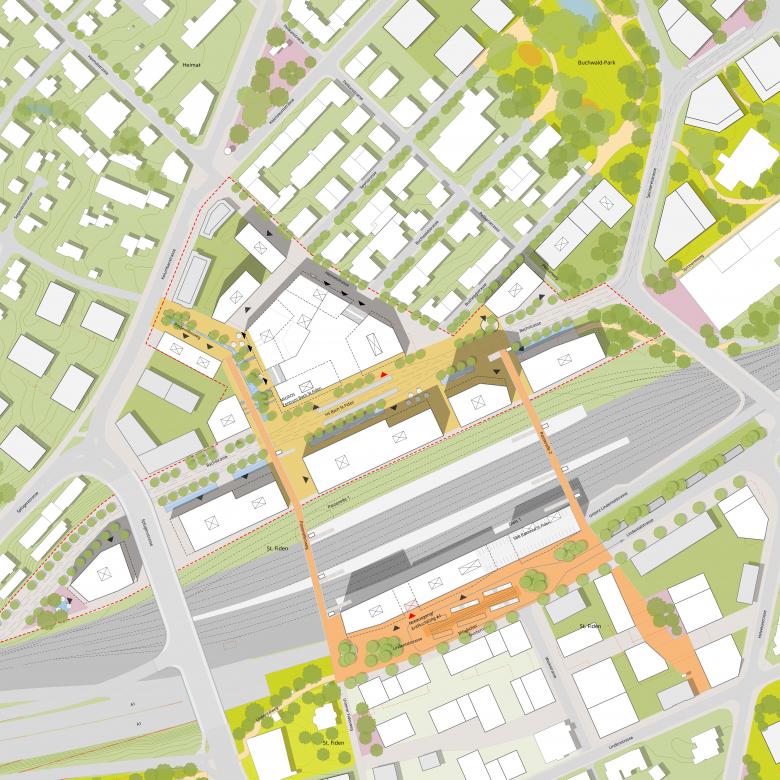 The plan focusses on three core areas: Bach-St. Fiden, the area of today‘s workshop and the Heiligkreuz district, which are located within the two existing city axes St. Jakobstrasse and Langgasse. An integral part of the future image of St. Fiden-Heiligkreuz is the development of a mobility concept that ensures the expected traffic flows for the core areas and enables a significant center function at St. Fiden station.