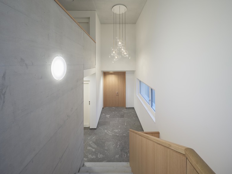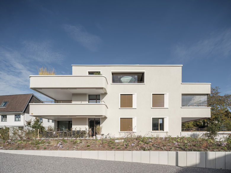 Bereits beim Betreten des Grundstückes wird das kleine feine Mehrfamilienhaus erlebbar. Der mit Hecken umrahmte Vorgarten markiert die nötige Privatsphäre der Liegenschaft. Das räumlich grosszügige Treppenhaus, ausgestattet mit warmen Materialien und einer subtilen Lichtgestaltung empfängt die Ankommenden bereits mit viel Wohnlichkeit. Die innere Erschliessung der fünf Geschosswohnungen und die Raumfolge gewährt in unterschiedlichen Varianten freie Durchblicke und Ausblicke auf die Berge und schafft dadurch eine wohltuende Grosszügigkeit.