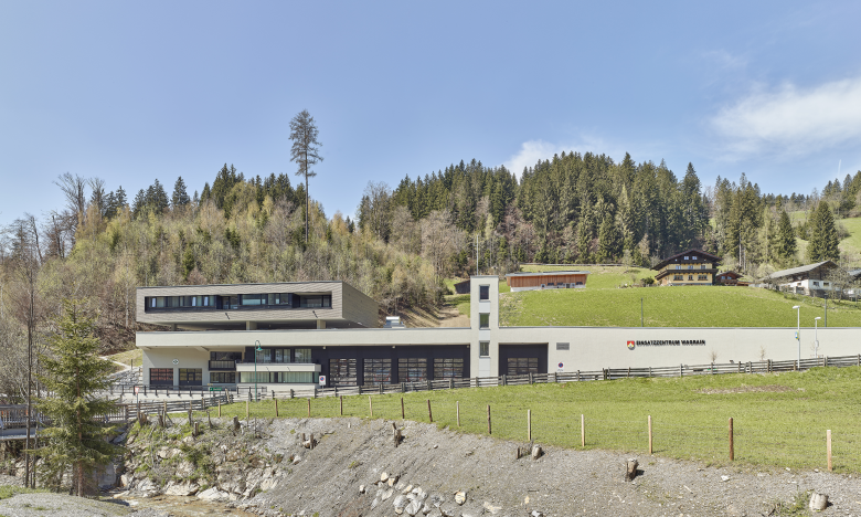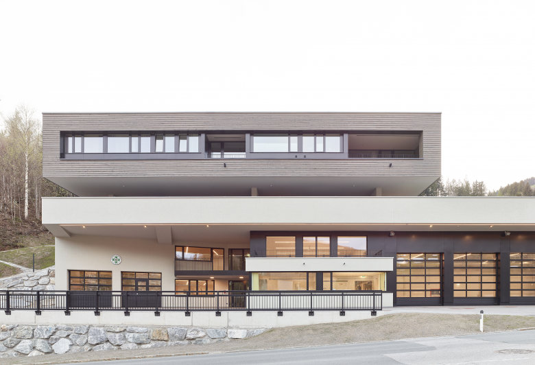 Um möglichst viel Grünraum zu erhalten, wurde die Baumasse einerseits in die Landschaft eingebettet – die Feuerwehr und die Bergrettung besiedeln das Erdgeschoss und ein Zwischengeschoss – andererseits wurden die weiteren Funktionsräume der Polizei kompakt in einem aufgeständerten separaten Baukörper im Obergeschoss untergebracht. So fährt man nun über die eingebetteten Hallen der Feuerwehr - auf der künstlich entstandenen Geländeebene - scheinbar ebenerdig auf das Gebäude zu und parkt zum Großteil überdacht unter den Räumlichkeiten der Polizei.