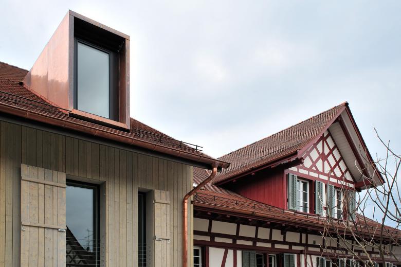 Das Projekt in Dielsdorf vereint historischen Erhalt und zeitgemäße Ergänzung, indem das denkmalprägende Haupthaus einer umfassenden Sanierung unterzogen und durch einen klar ablesbaren Neubau erweitert wurde. Während die maroden Anbauten rückgebaut wurden, entstand durch die kompakte Ergänzung mehr Raum für hofartige Außenbereiche auf der südlichen, verkehrsabgewandten Seite, die privaten und gemeinschaftlichen Nutzungen dienen. Die Erweiterung setzt sich durch ihre Formensprache und Materialität bewusst vom Bestand ab, tritt jedoch nicht in Konkurrenz zu ihm, sondern ergänzt ihn harmonisch im Sinne der gewachsenen Baugeschichte. Die volumetrische Setzung nimmt Bezug auf die ursprüngliche Struktur der Metzgerhalle und interpretiert die Tradition angebauter Wirtschaftsgebäude in einer modernen Architektursprache weiter. So entsteht ein spannungsvolles Zusammenspiel aus Alt und Neu, das Identität bewahrt und gleichzeitig eine neue Wohnqualität schafft.