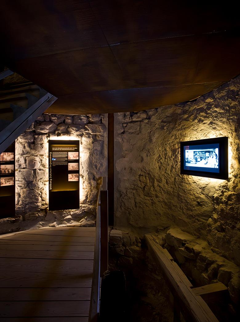 Der denkmalgeschützte Schlossturm ist ein prägendes Wahrzeichen des Zürcher Unterlands und vereint beeindruckende historische Substanz mit zeitgemäßer Gestaltung. Die archaische Wirkung des bis zu 21 Meter hohen Turms mit drei Meter dicken Mauern wird durch den konsequenten Einsatz von rostigem Stahl für die neuen Einbauten unterstrichen. Die reduzierte Haustechnik, geschickt ins Mauerwerk integriert, lenkt den Fokus auf das historische Gemäuer und die ausgestellten Exponate. Die Ausstellung im Inneren führt die Besucher chronologisch durch die Ortsgeschichte, von mittelalterlichen Anfängen im Erdgeschoss bis ins 20. Jahrhundert im obersten Stockwerk. Mit dem Aufstieg zur Zinne eröffnet sich der Blick in die Neuzeit, unterstützt von einer filigran gestalteten, wettergeschützten Fiberglaskonstruktion, die sich harmonisch in die historische Architektur einfügt.