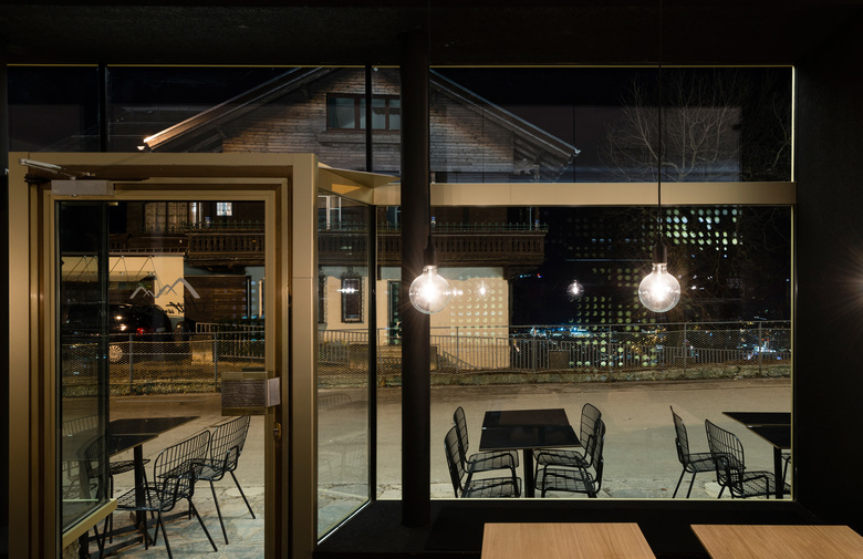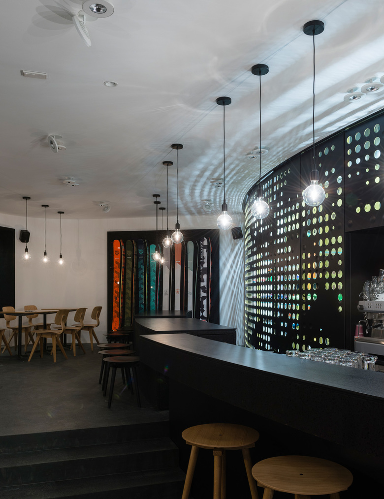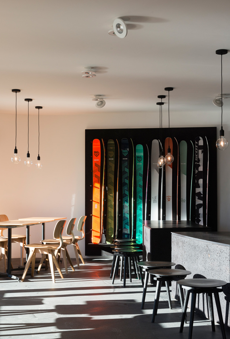 Für die Architektur eine interessante und anspruchsvolle Herausforderung zumal es die Grenzen zwischen Lokal und Shop zu überwinden galt. Grundlegend für das Gestaltungskonzept war es im Spannungsfeld zwischen Hungerburgbahn und Nordkettenbahn - Tiroler Moderne und Avantgarde, unter Bezugnahme auf die Material- und Gestaltungsästhetik der 60er Jahre, die Essenz des ursprünglichen Gebäudeentwurfes wieder herzustellen und im Innenraum erlebbar zu machen.