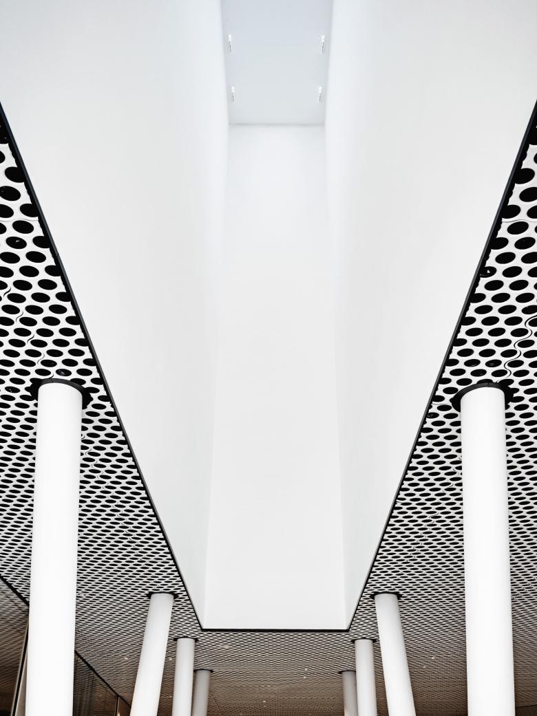 Das neukonzipierte Foyer erfährt mit dem Austausch raumtrennender Wandscheiben durch freistehende Stahlstützen eine direkte Öffnung zum umgebenden Außenraum.
