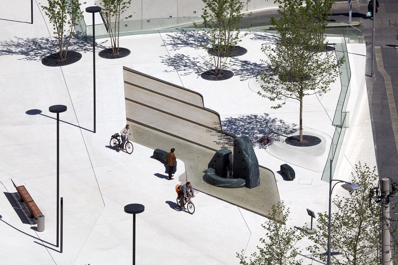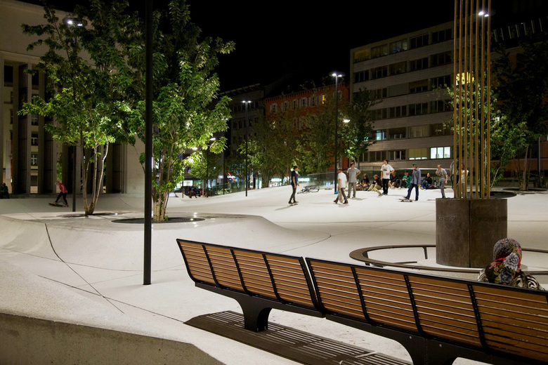 Die Textur des Oberflächenbelages wechselt in teils fließenden, teils abrupten Übergängen je nach Nutzungsanforderung von rauh bis zu hochglanzpoliert. So entstehen vielfältig nutzbare Freiflächen, Hügel, Brunnen, „Podeste“ für Denkmäler, Sitzgelegenheiten. Sitzbänke sind unter den zahlreichen Baumgruppen verteilt. Zusätzlich kann Standard-Mobiliar je nach Bedarf frei auf diesem Forum aufgestellt werden.
