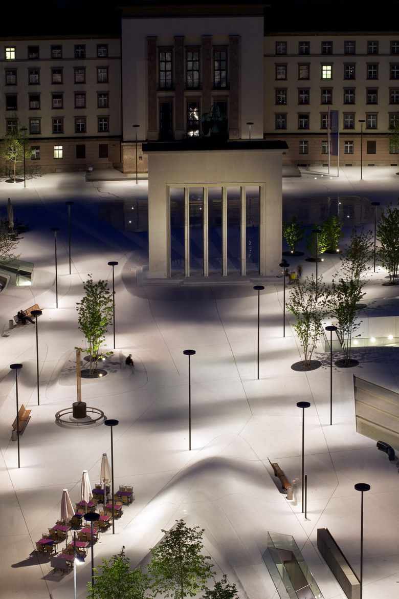 Nachts sind es die Passanten und die Topographie selbst, die im Fokus stehen. Eine gezielte Bestrahlung der hellen Bodenplastik wirft indirektes Licht in die Umgebung zurück und leitet Passanten sicher über den Platz. Das reflektierende Licht vom Boden verhindert unbeleuchtete Stellen, die Denkmäler nehmen sich zurück.