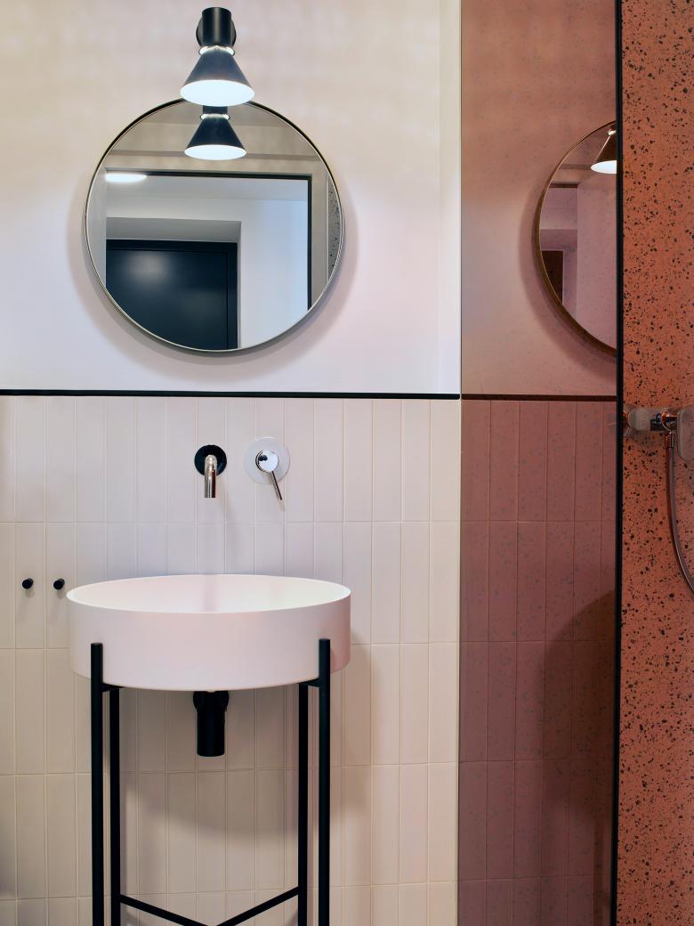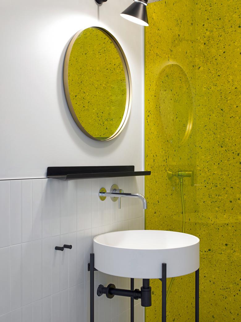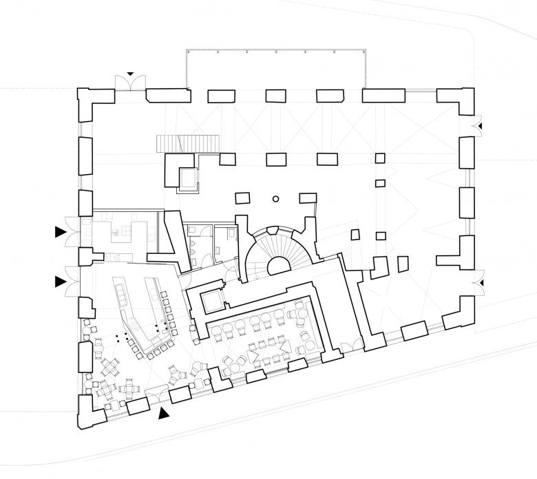 Die Assemblage verbindet als pluralistischer Gestaltungsansatz in diesem Entwurf verschiedenste Materialien, Formen, Farben und Muster in überraschender Weise. So wechselt die Bestandsdecke von einem Gewölbe in eine gerade Decke mit Unterzügen, das Barmöbel verbindet Edelstahl und Holz, und der Terrazzo Fußboden Stein und Glas.