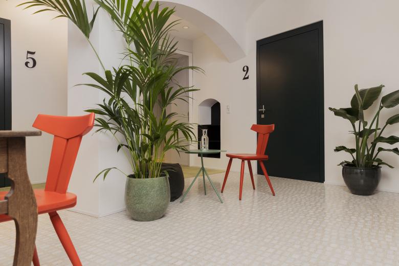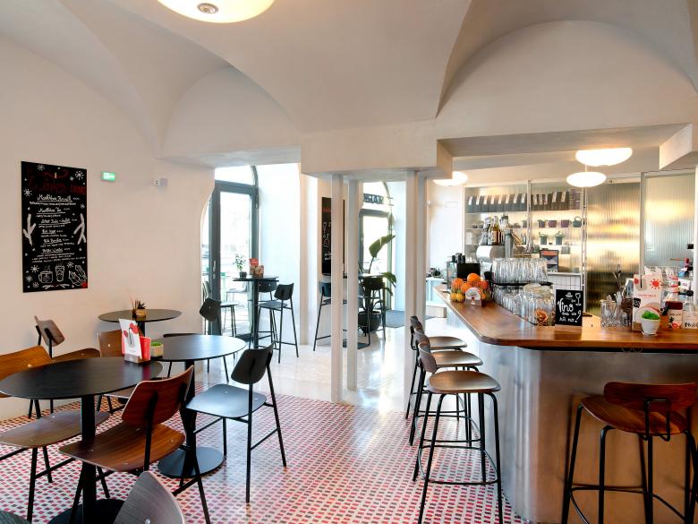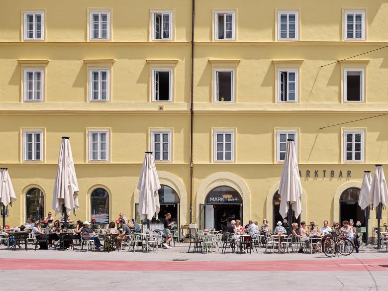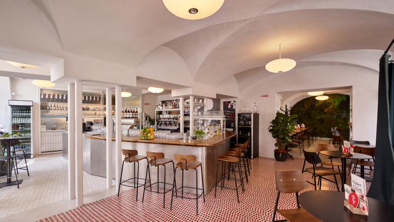 Die Grenzen zwischen Gast und Gastgeber lösen sich durch das niedere Barmöbel auf und das Lokal öffnet sich durch neue Portale zum Marktplatz und dem Gastgarten hin.