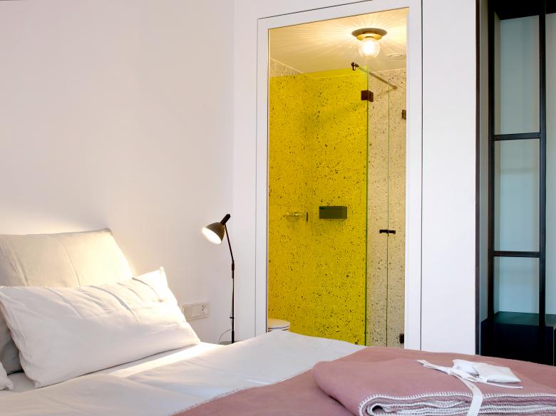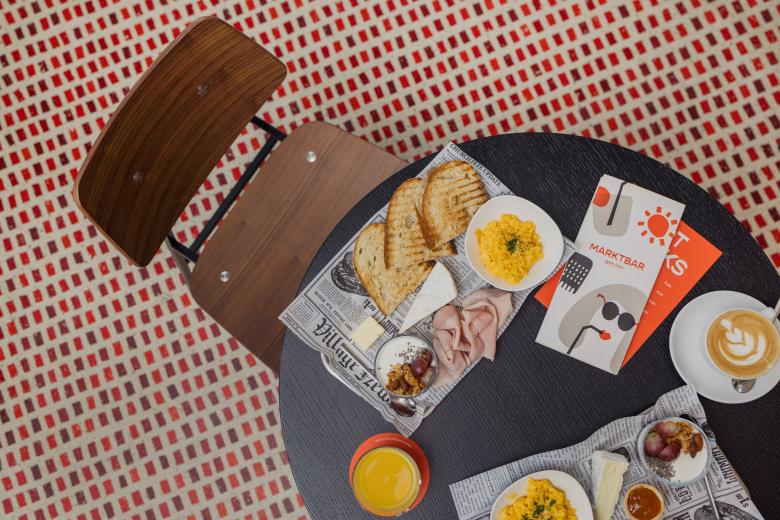 Die Gestaltung der zugehörigen Hotelzimmer – der Marktbar Studios - entspricht dem Entwurfskonzept der Marktbar und übersetzt dieses in eine privatere Situation. Die Studios sind zwar im Standard eines Boutique Hotels ausgestattet, bieten aber bewusst die Qualität einer Altbauwohnung.