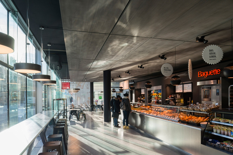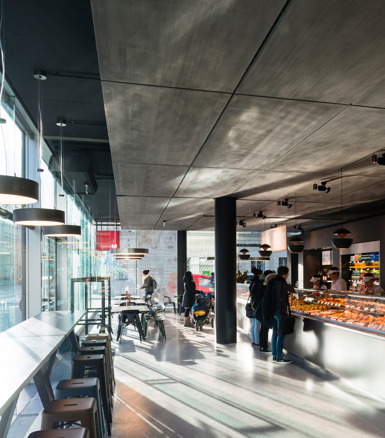 Für die umgbenden Institutionen Universität, und Schulen wird das Gastronomieangebot durch den kleinen Lebensmittelmarkt im Sinne der Selbstversorgung ergänzt. Frische Produkte, Obst, Salat und Gemüse werden auf Materialien präsentiert, welche als hochwertiger Streetstyle wahrgenommen werden kann.